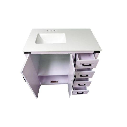 Our 36” White Lilac Vanity with a new-school farmhouse feel. The intricate cross-hatch door design provides a striking focal point, and the pop of the black rustic hardware completes the look. This vanity is capped with a white Cultured Marble top with an undermount sink. The cabinet comes fully assembled and has a ton of storage!