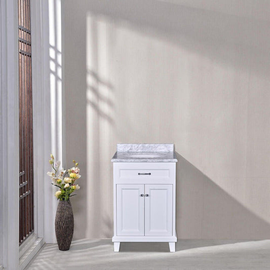 Our 24" White Vanity With Solid Wood & Carrara Marble Top has a sophisticated look and elegant design. Made from solid wood and real marble. Perfect for small and medium-sized bathrooms.