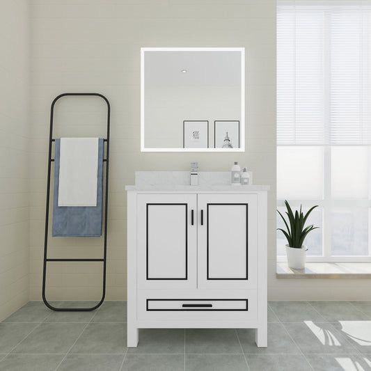 Duko Venice 30" Wooden Vanity Set With White Cararra Marble Tabletop, Rectangular Single Basin and Drawer Cabinet White