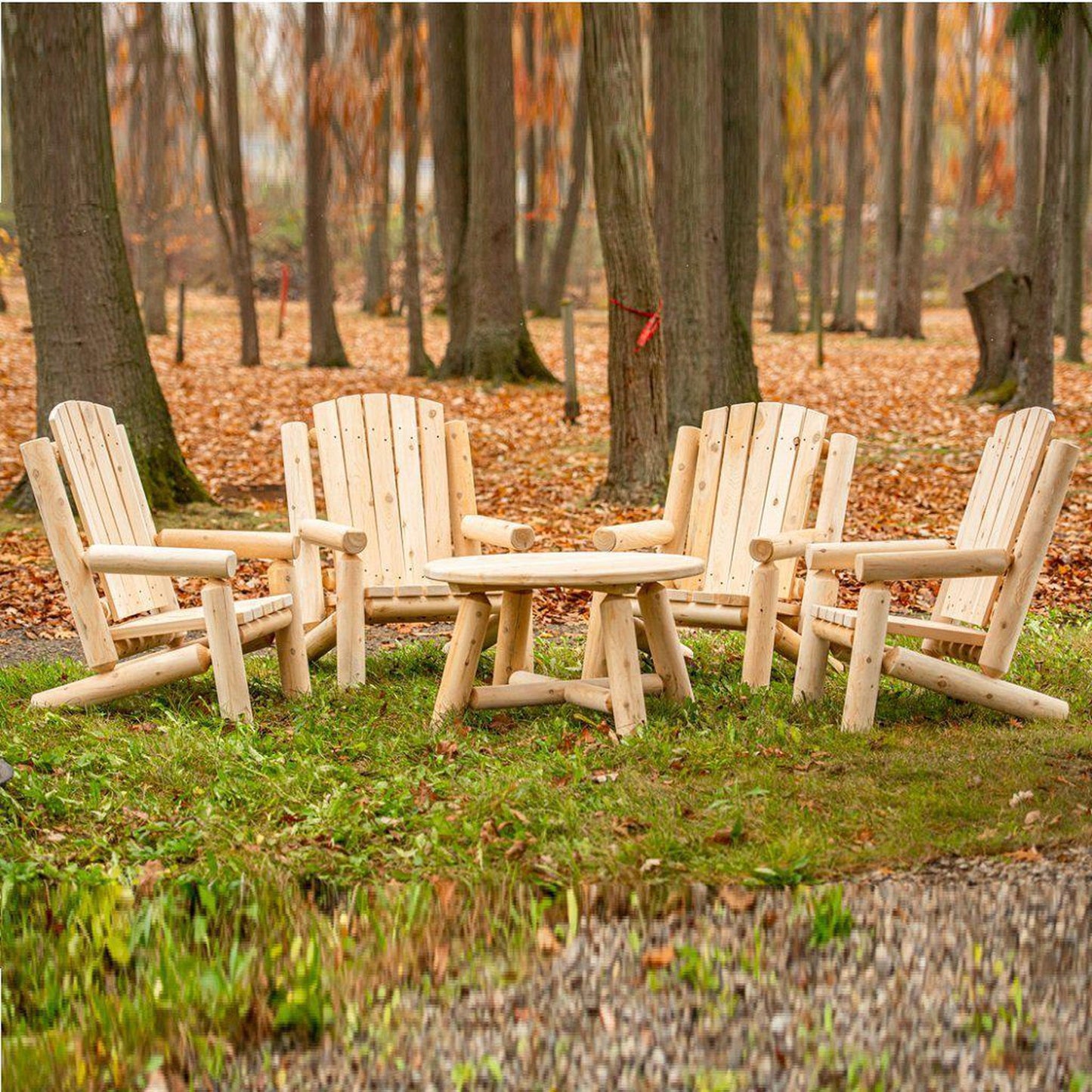 Unfinished and boxed white cedar family seating set. Comes with 4 chairs and 1 coffee table. Standard Log chairs and benches have half log back slats and full depth seat slats for the original log look.