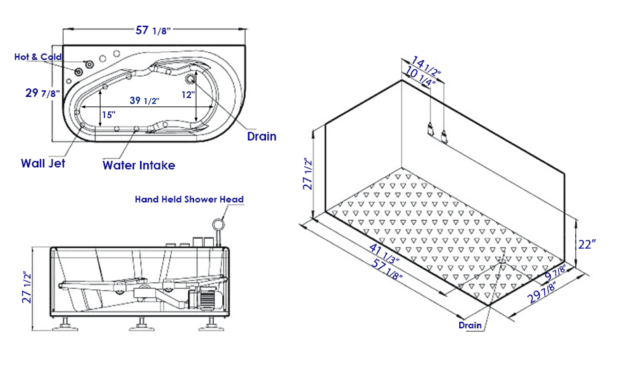 - Tub must be installed flush to wall, as one side is open for easy access.