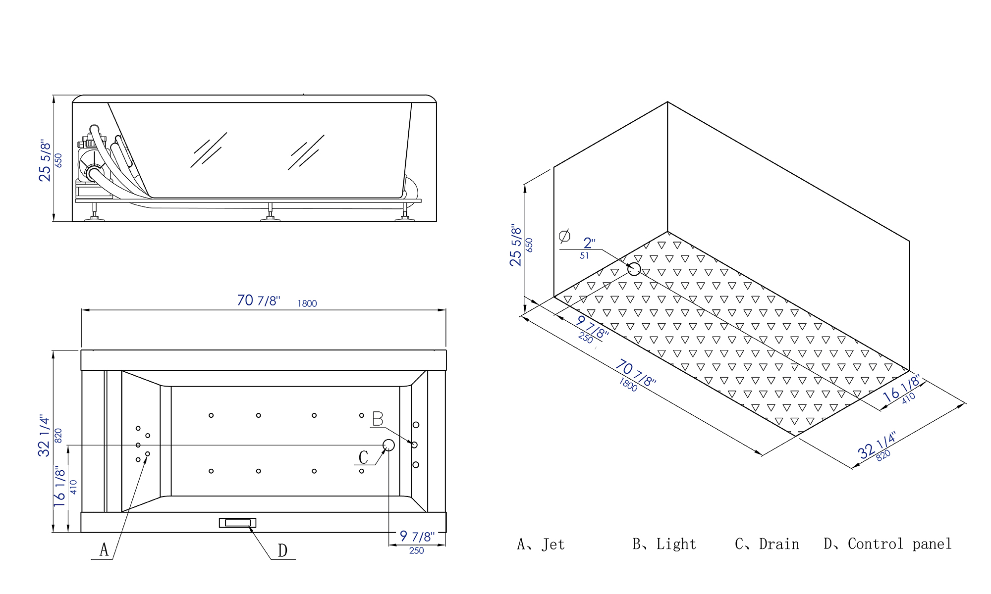 - Keypad Control Panel: Stylish control panel easily operates the bathtubs whirlpool jets, inline heater, digital sound system, and chromatherapy lighting.