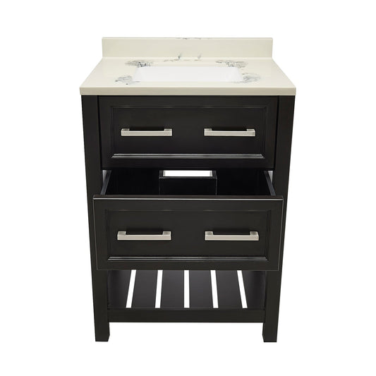 The Tremblant 25 in. vanity collection blends classic and modern designs for a transitional style to match any bathroom décor. The beauty of the Tremblant collection resides in its simplicity – two drawers on the front with a spacious, open-air shelf below.