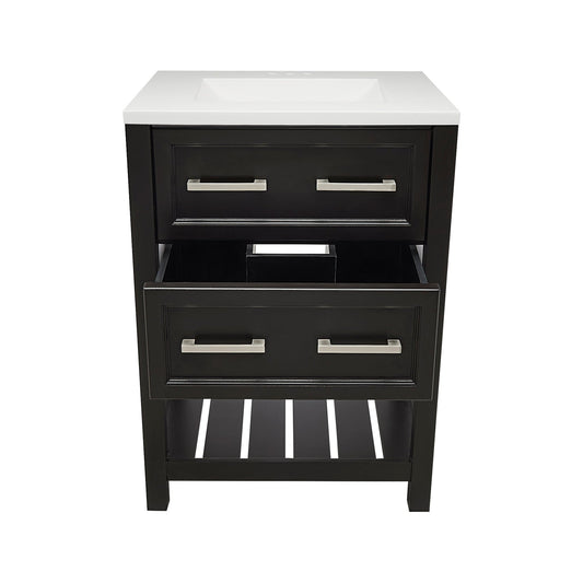 The Tremblant 25 in. vanity collection blends classic and modern designs for a transitional style to match any bathroom décor. The beauty of the Tremblant collection resides in its simplicity – two drawers on the front with a spacious, open-air shelf below.