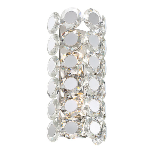 The Perrene offers a modern look with its ordained with coveted crystals, both sides showcase beveled texture that brings dramatic elegance. The mirrored chrome center helps reflect the light for an even more opulent display of light.