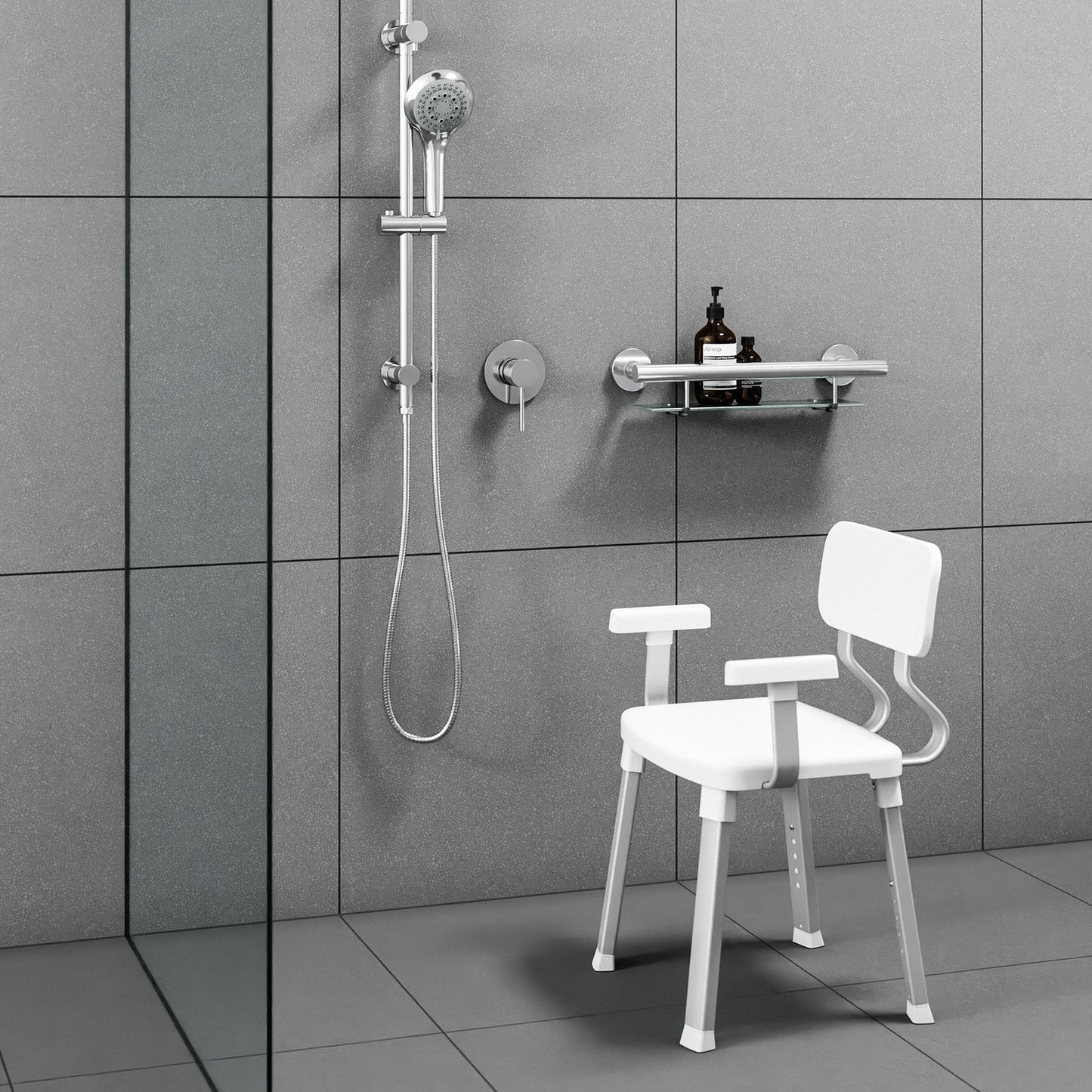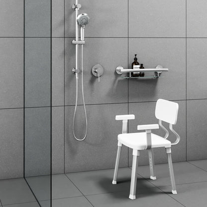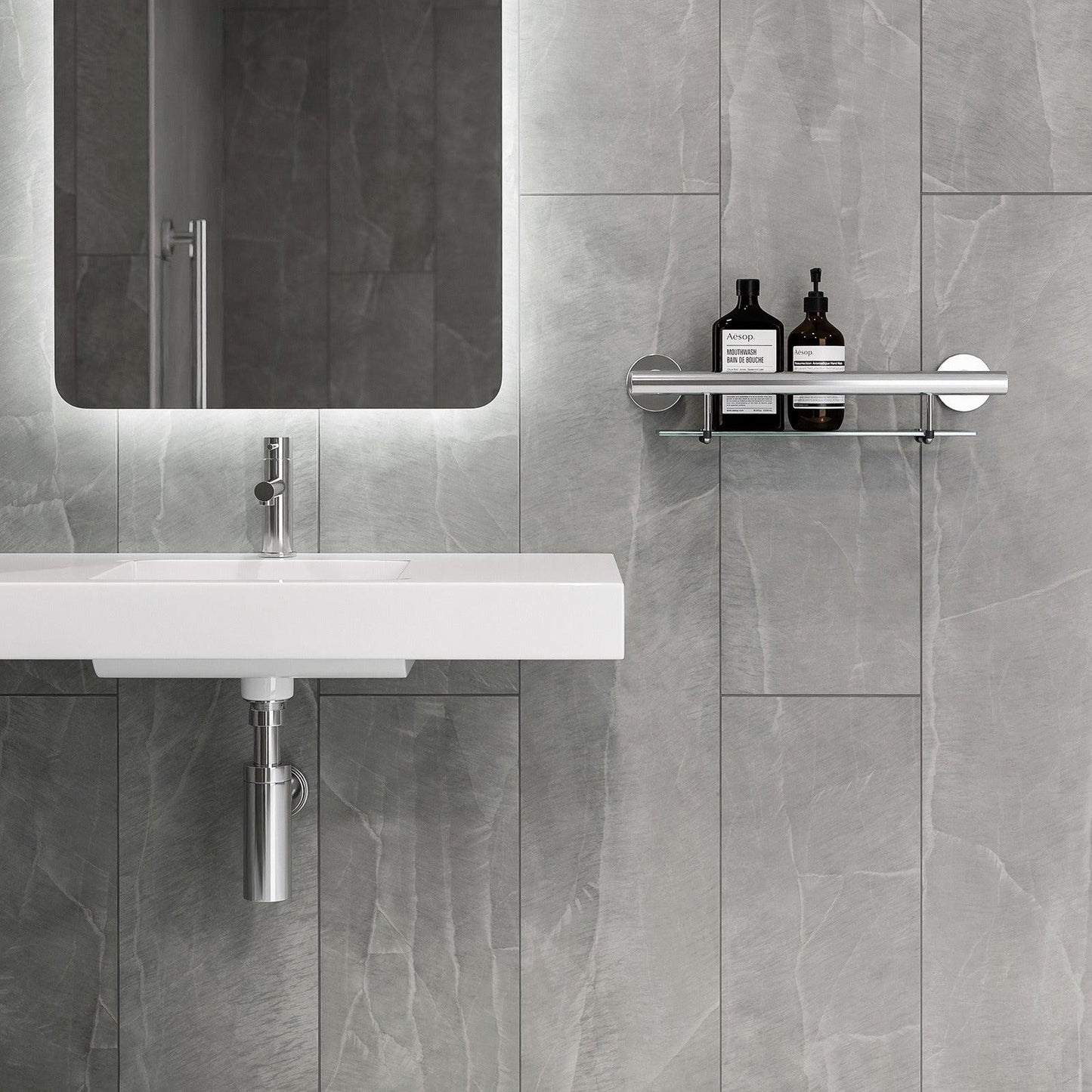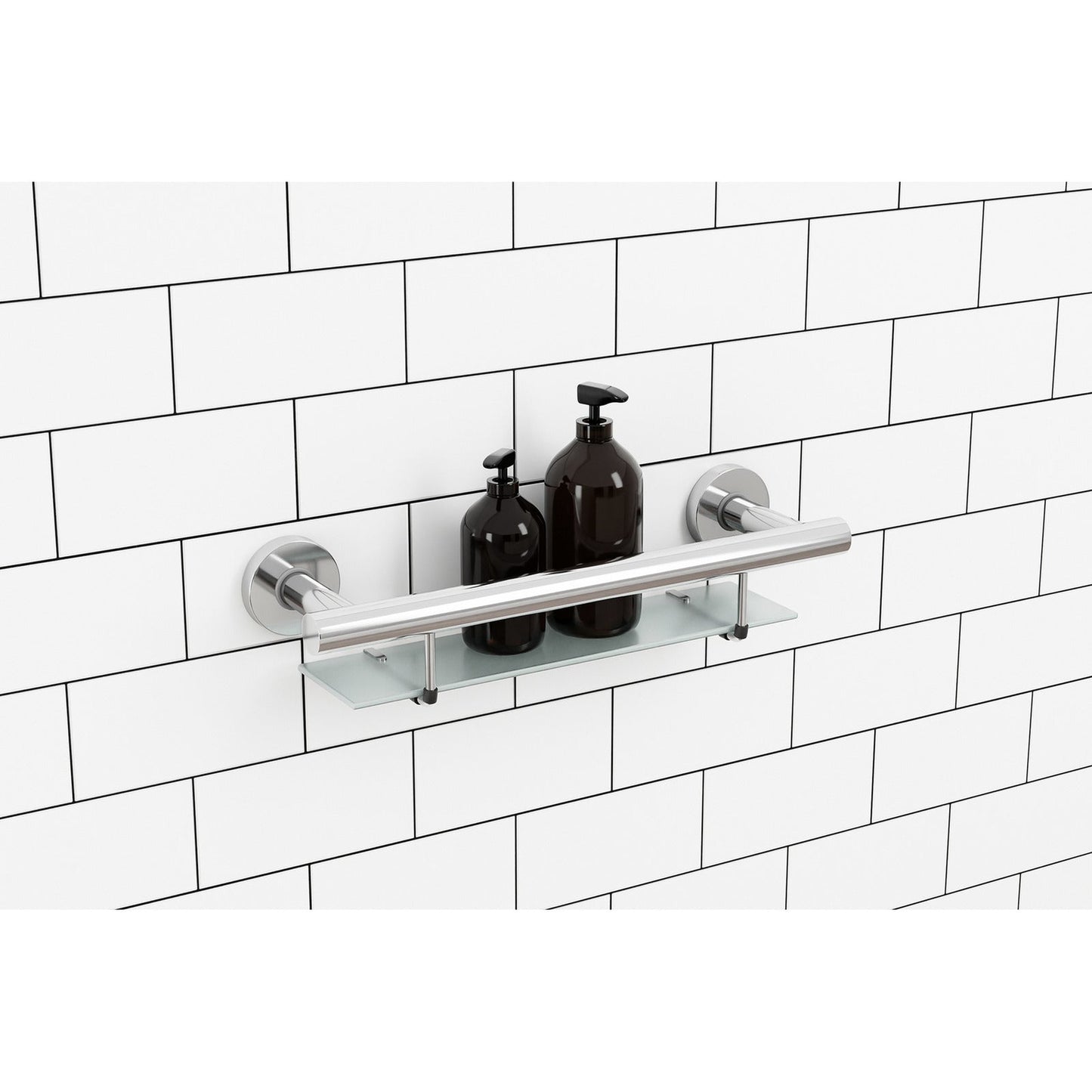 Evekare manufactures a wide range of grab bars that are suitable for independent living and aged care applications. Bath shelf grab bars can be installed anywhere in the bathroom and provide added support. This grab bar has the added benefit of featuring a frosted glass shelf. It can be used as a storage space for bathroom and shower items such as shampoo and soap bottles. This range is secured to the wall with screws and features cover plates to conceal the mounts for a cleaner and stylish appearance. This grab bar is constructed from quality grade 304 stainless steel and can support up to 550 lbs.