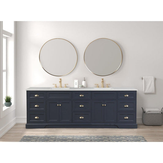 Add elegance and head-turning style to renovate your bathroom decor with the stunning Eviva Epic bathroom vanity. It features a very spacious storage nine functional drawers and four doors to keep your toiletries and spare towels close by. The vanity is very durable as it is made of solid wood which is complemented by a high quality Quartz counter-top. The vanity also features undermount double sinks and three pre-drilled holes for the 8 in. widespread faucet of your choice.