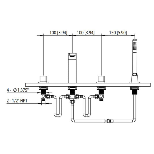 Isenberg’s Four Hole Deck Mount Bathtub faucets have a separate hot and cold handle with a hand shower and hose. The back of the spout has a push pull diverter which can be used to toggle the water flow between the hand shower and tub spout. These products installed on the deck next to the edge of the bathtub with 4 drilled holes that are each about 4 inches apart each. The faucet body and handles are all separate pieces with valves concealed under the tub.