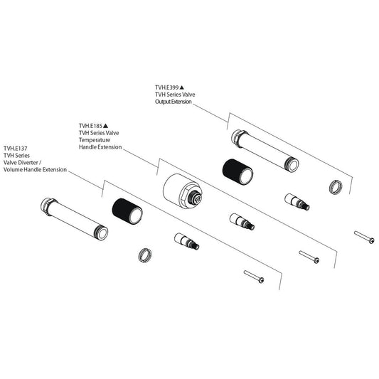 The TVH.2691E extension kit consists of two diverter handle extensions, a temperature handle extension and two output extensions. This extension kit is to be used with the Isenberg TVH.2691 valve. It is used when the valve is installed too deep into the wall and the handles need to be extended out further. The extension measures 1.4” in length.