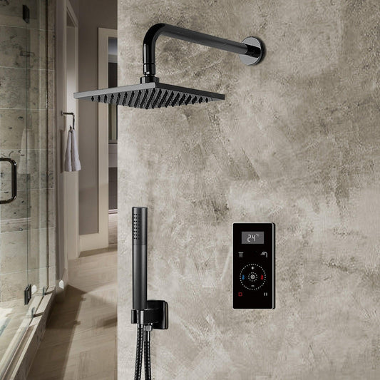 Fontana 16" Matte Black Square Wall-Mounted Automatic Thermostatic Shower With Black Digital Touch Screen Shower Mixer Display 2-Function Rainfall Shower Set With Hand Shower
