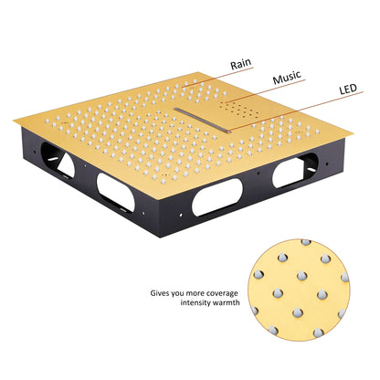 Rejuvenate the way you shower with the Fontana Cuenca Gold Multifunctional LED Music Shower Head which skillfully combines the richness and sophistication of fixture design with advanced technology. This will ideally act as the centerpiece for bathrooms and is made from superior quality stainless steel. The stunning gold finish adds elegance and sophistication easily integrating with your decoration. This multi functional shower head offers a variety of options sure to make your daily routine so much better. Enjoy a soothing rainfall effect refresh yourself from a waterfall stream or for simple convenience switch on the handheld shower. For added luxury, switch on the body jets to create a spa atmosphere in the comfort of your home. One great thing about this model is the integrated LED lighting system which gives you options of color changes via a remote control.
