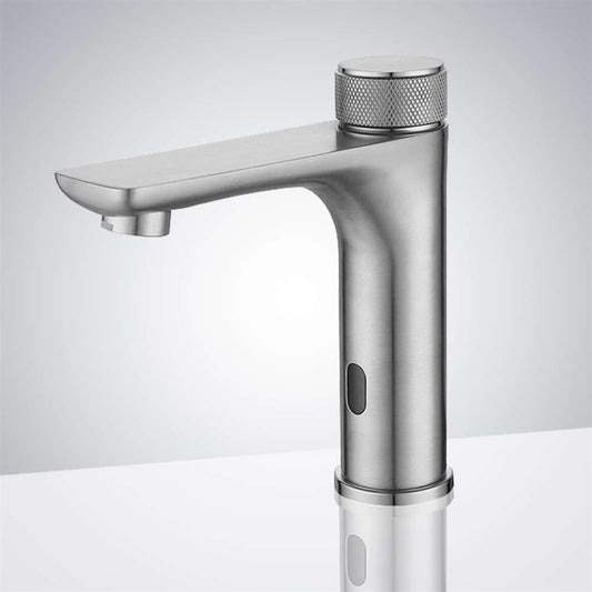 The Fontana Brushed Nickel Smart Touchless Bathroom Sink Faucet is a modern and high-quality faucet that is designed for easy and commercial use. This fontana commercial deck-mounted touchless sensor faucet features a single hole installation. Ideal for small or minimalist bathroom designs. The brushed nickel finish gives it a sleek and contemporary look that complements any bathroom decor. The faucet comes equipped with a smart sensor that allows for touchless operation, making it a hygienic option for your bathroom sink. This smart sensor faucet is customizable. The touchless feature allows you to easily control the flow of water without having to touch the faucet, reducing the risk of cross-contamination and helping to maintain a clean and healthy environment. This smart sensor faucet is built to last with high-quality materials, including a ceramic valve core that ensures long-lasting and reliable performance. You can easily adjust the water temperature to your liking with it's hot and cold water controlling system.