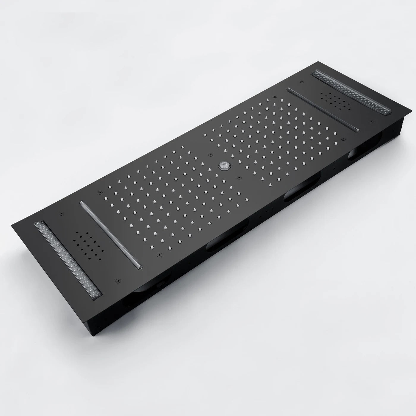 The Fontana Hazebrouck Matte Black Multi-Function Ceiling Mounted Massage Shower Head is, in fact, the real epitome of sophistication since it features avant-garde functionality coupled with modern design to give an ultra-luxurious experience. Made from high-quality stainless steel and finished in brilliant chrome, this fixture deserves a place in any hotel, spa, or high-class bathroom. The large bar-shaped unit measures 35.43 x 11.81 inches and is multi-functional, performing rainfall, waterfall, water column, and magic waterfall. Plus, it has remote-controlled LED lighting to select 64 shades of color to add to the ambiance. It has built-in Bluetooth connectivity for music, adding to its appeal and making it perfect for spa ambiance. It has been designed for easy ceiling-mounted installation and offers a flow rate of 16-28L/min at water pressure ≥0.3MPA, hence ideal for modern high-end spaces.