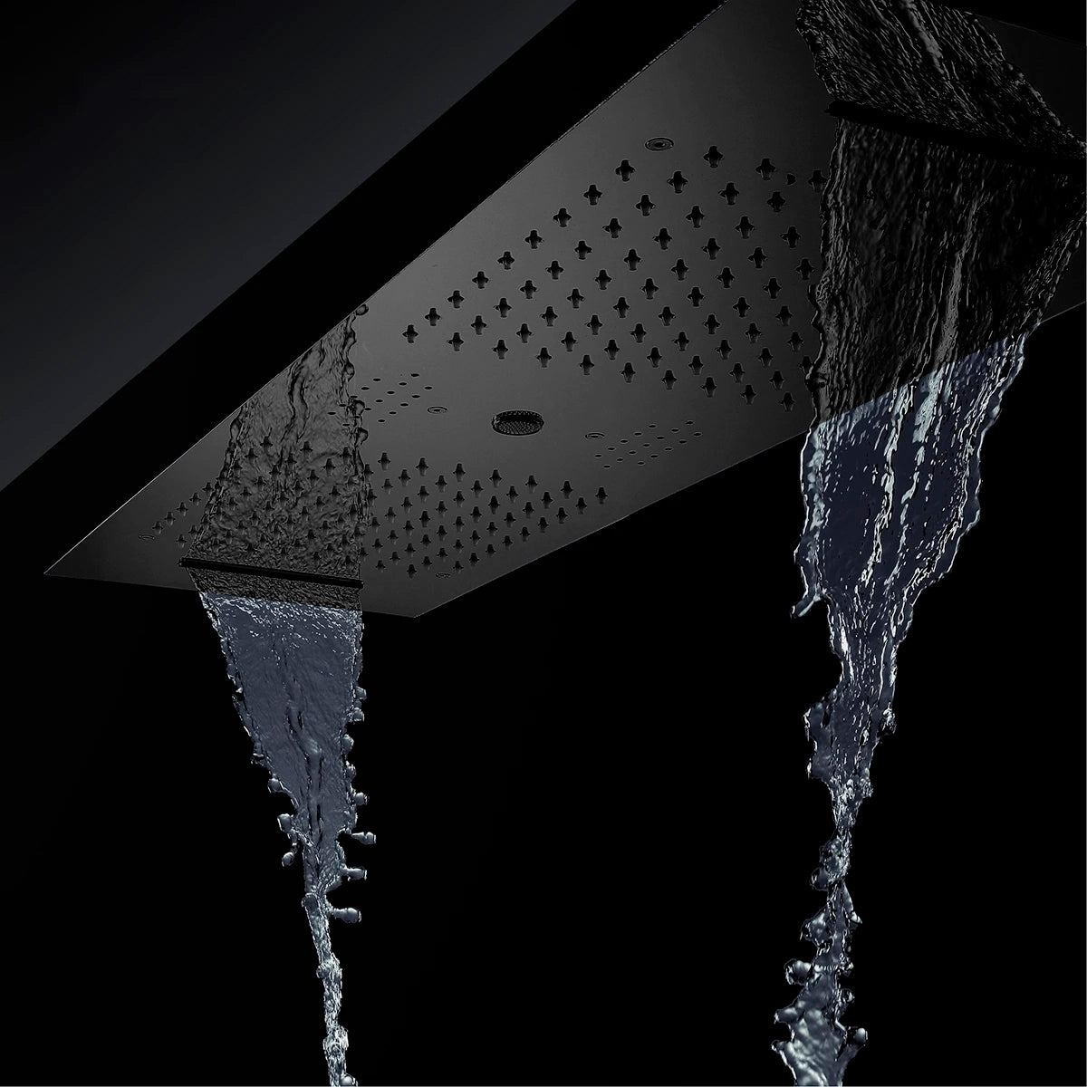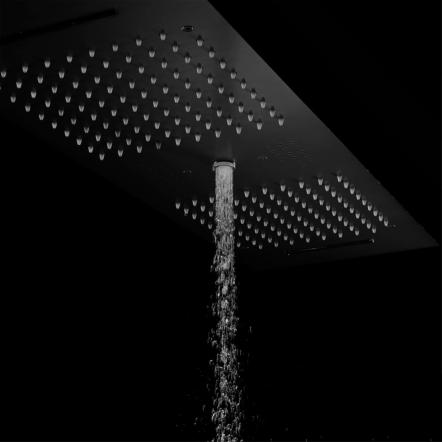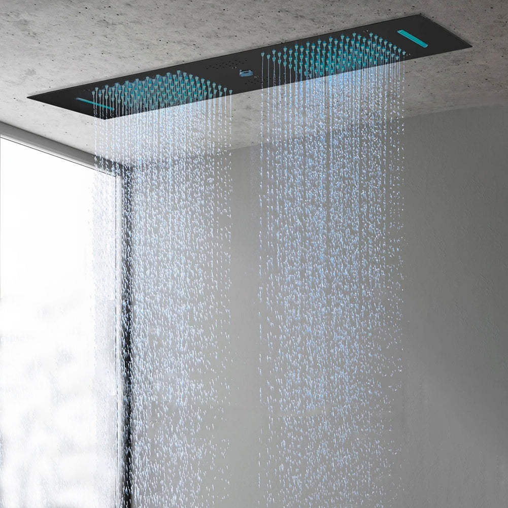 Step into the future of showering with the Fontana Hydro Silk Matte Black Phone Control Ceiling Mounted Shower Head. This elegant shoe head from the known brand, FontanaShowers® boasts an elegant matte black finish on a sturdy stainless steel construction, designed to add a touch of modern sophistication to any bathroom. The ceiling-mounted installation not only maximizes space but also enhances the clean, minimalistic appeal of your shower area. At the heart of its design is a high-quality ceramic valve core, which ensures seamless operation with both hot and cold water, tailored to your comfort preferences. Control your shower experience right from your phone with intuitive phone control features that allow you to switch between Rainfall, Waterfall, and Water Column settings. For those who love to blend music with their shower routine, this unit comes equipped with Bluetooth connectivity, allowing you to stream your favorite tunes directly into your shower space. Complemented by LED lights that cycle through 64 colors per minute, it creates a truly immersive environment that can transform a daily routine into a dynamic, rejuvenating experience. The bar-shaped shower head measures an expansive 36 by 12 inches (900 by 300mm), providing wide coverage that envelops you completely. With a flow rate of 16-28 liters per minute and a minimum water pressure of 0.3 MPA, the Fontana Hydro Silk delivers more than just a basic shower—it provides a luxurious and technologically advanced experience.