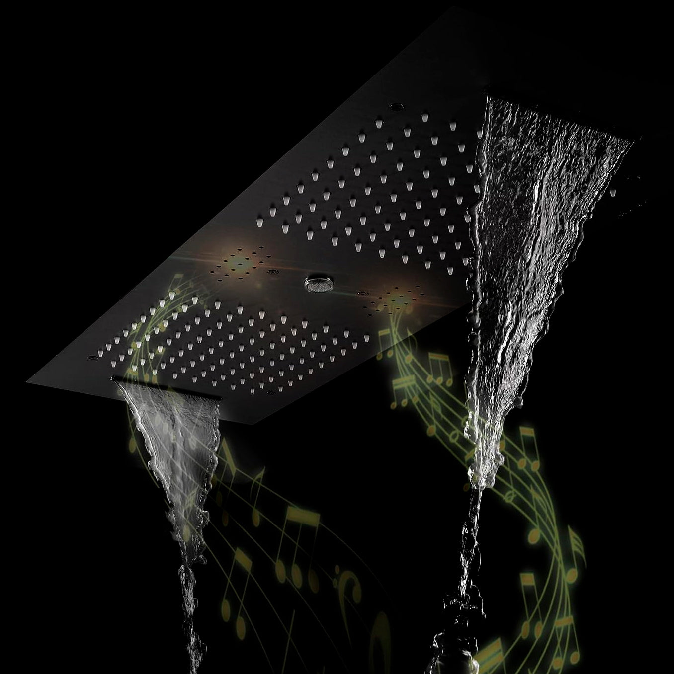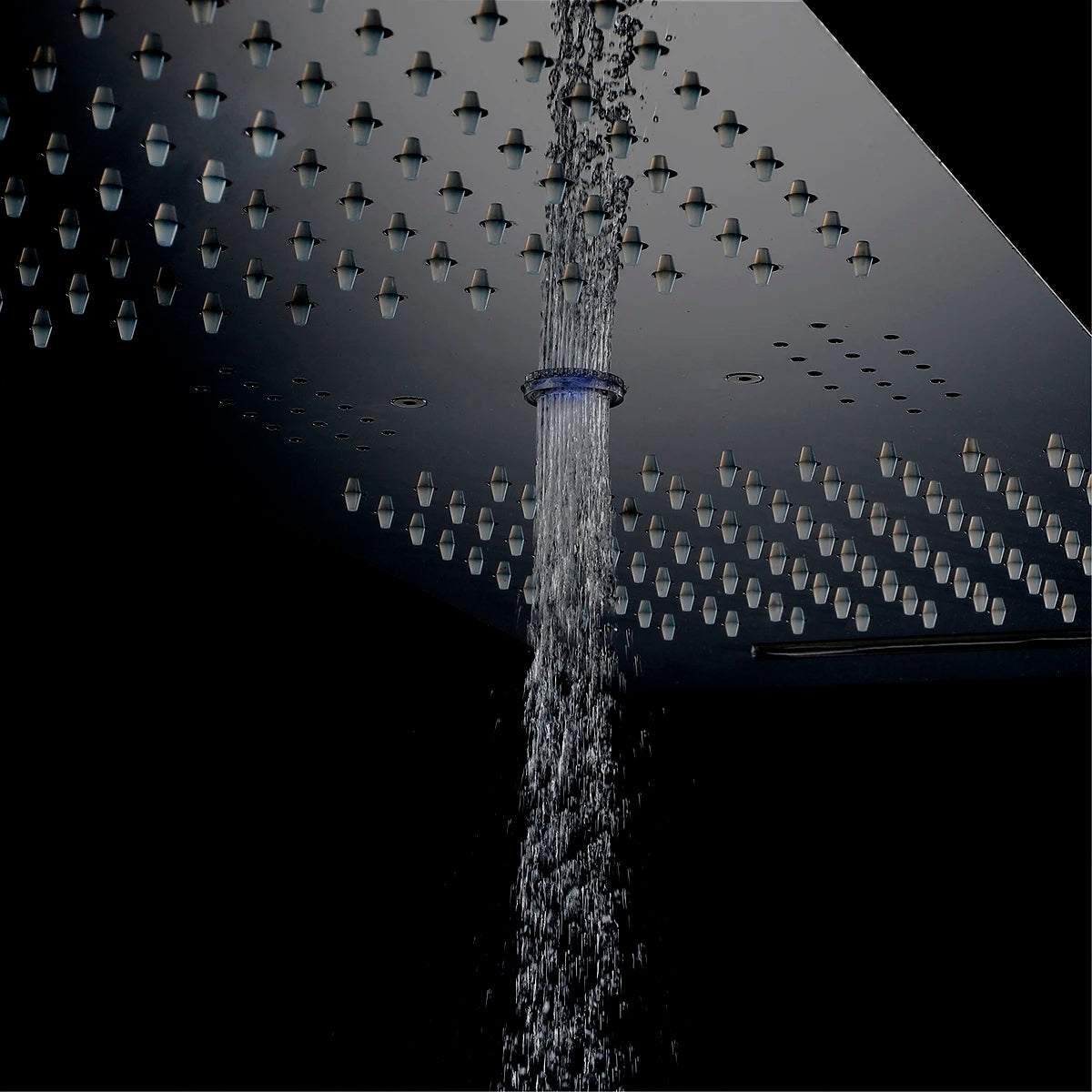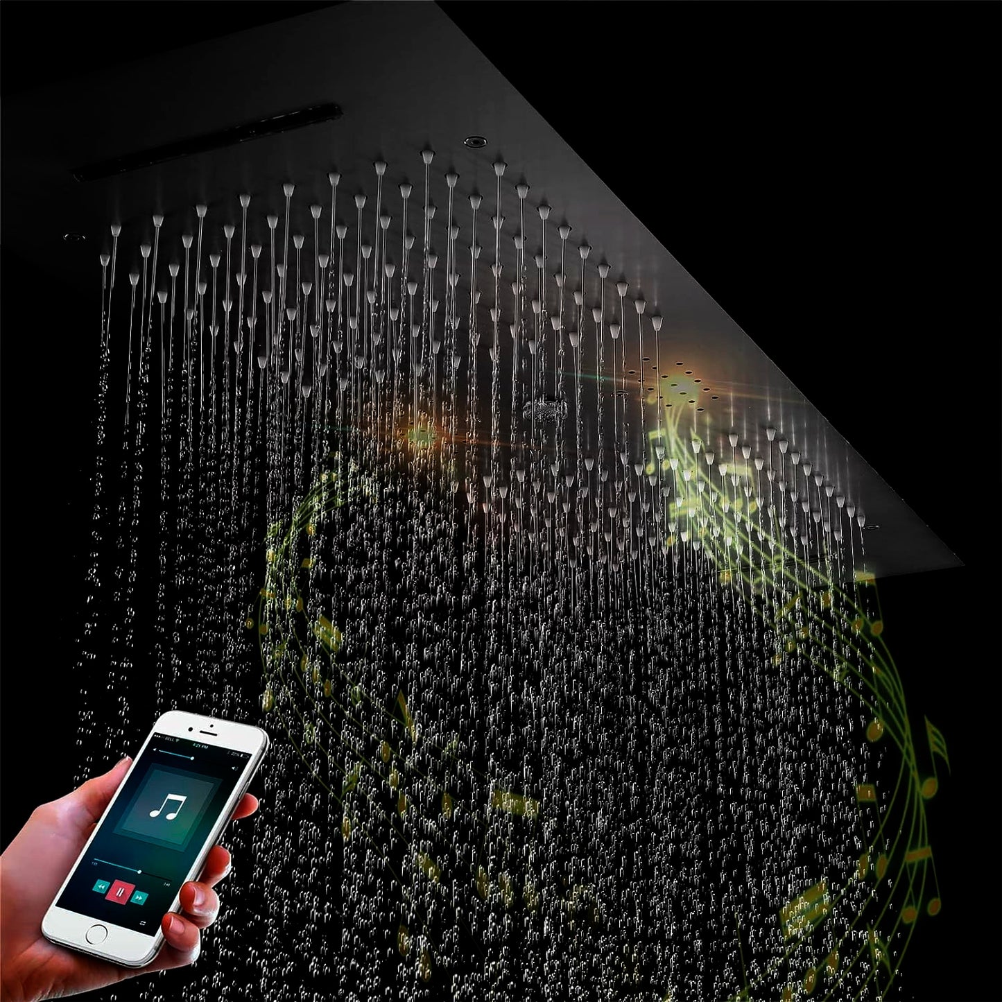 Step into the future of showering with the Fontana Hydro Silk Matte Black Phone Control Ceiling Mounted Shower Head. This elegant shoe head from the known brand, FontanaShowers® boasts an elegant matte black finish on a sturdy stainless steel construction, designed to add a touch of modern sophistication to any bathroom. The ceiling-mounted installation not only maximizes space but also enhances the clean, minimalistic appeal of your shower area. At the heart of its design is a high-quality ceramic valve core, which ensures seamless operation with both hot and cold water, tailored to your comfort preferences. Control your shower experience right from your phone with intuitive phone control features that allow you to switch between Rainfall, Waterfall, and Water Column settings. For those who love to blend music with their shower routine, this unit comes equipped with Bluetooth connectivity, allowing you to stream your favorite tunes directly into your shower space. Complemented by LED lights that cycle through 64 colors per minute, it creates a truly immersive environment that can transform a daily routine into a dynamic, rejuvenating experience. The bar-shaped shower head measures an expansive 36 by 12 inches (900 by 300mm), providing wide coverage that envelops you completely. With a flow rate of 16-28 liters per minute and a minimum water pressure of 0.3 MPA, the Fontana Hydro Silk delivers more than just a basic shower—it provides a luxurious and technologically advanced experience.