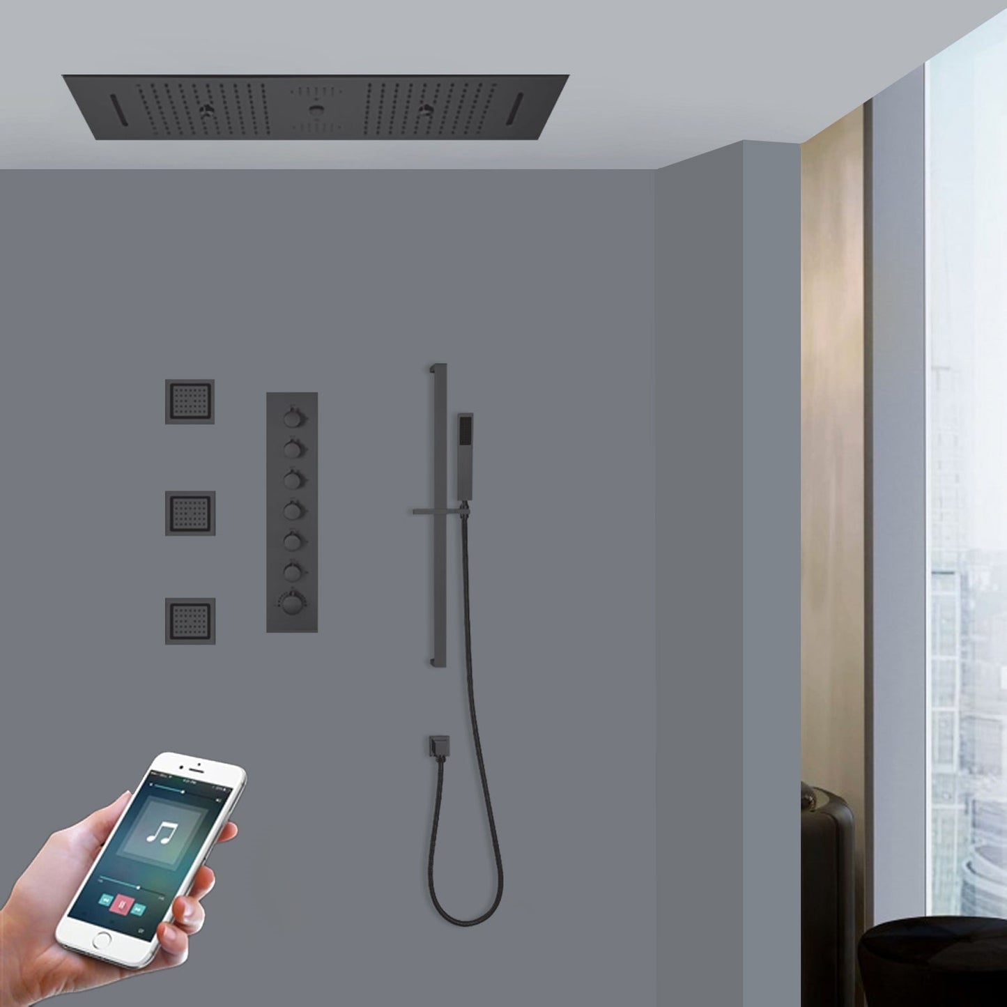 Ravenna Large Phone Controlled Matte Black Thermostatic Recessed Ceiling Mount Musical LED Mist Waterfall Rainfall Shower System with Hand Shower and Jetted Body Sprays