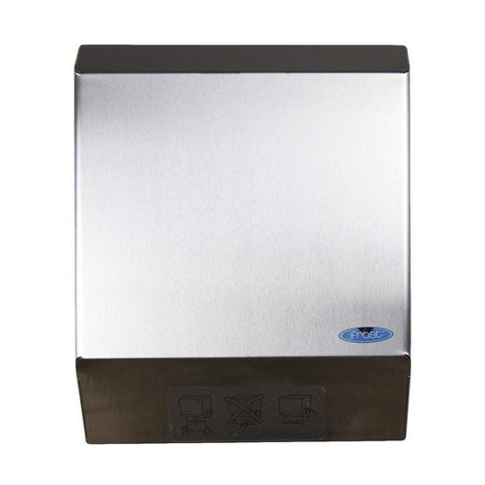 Frost 109-60S mechanical hands free universal paper towel dispenser offers a quality and reliable product with a professional stainless steel appearance. Typically, this product is used in Schools/Universities, Offices, Restaurants, Service Stations, and Industrial Settings where hands free operation is preferred. The product’s ease of use and maintenance, along with its durable stainless steel body make it a popular option. Frost code 109-60S is designed to dispense Jumbo 8″ diameter x 8″ wide roll towels, core size of 1 ⅜″ and greater. The units are universal; meaning, the unit is non-proprietary and dispenses paper from standard commercial paper producers. This allows the end user to avoid getting locked into paper supply contracts and should save them money on their janitorial supplies. The product is mechanically operated when pulling on the exposed length of towel the touch free paper towel dispenser will automatically cut an 27cm (11”) length, leaving 7.6cm (3″) length of towel to grab onto for next dispensing action. If more paper is not visible for the next use, simply turn the knob on the side of the unit to advance the paper inside. Frost 109-60S universal paper towel dispenser will hold one jumbo 8” x 8” paper towel roll, core size of 1 ⅜″ and greater.