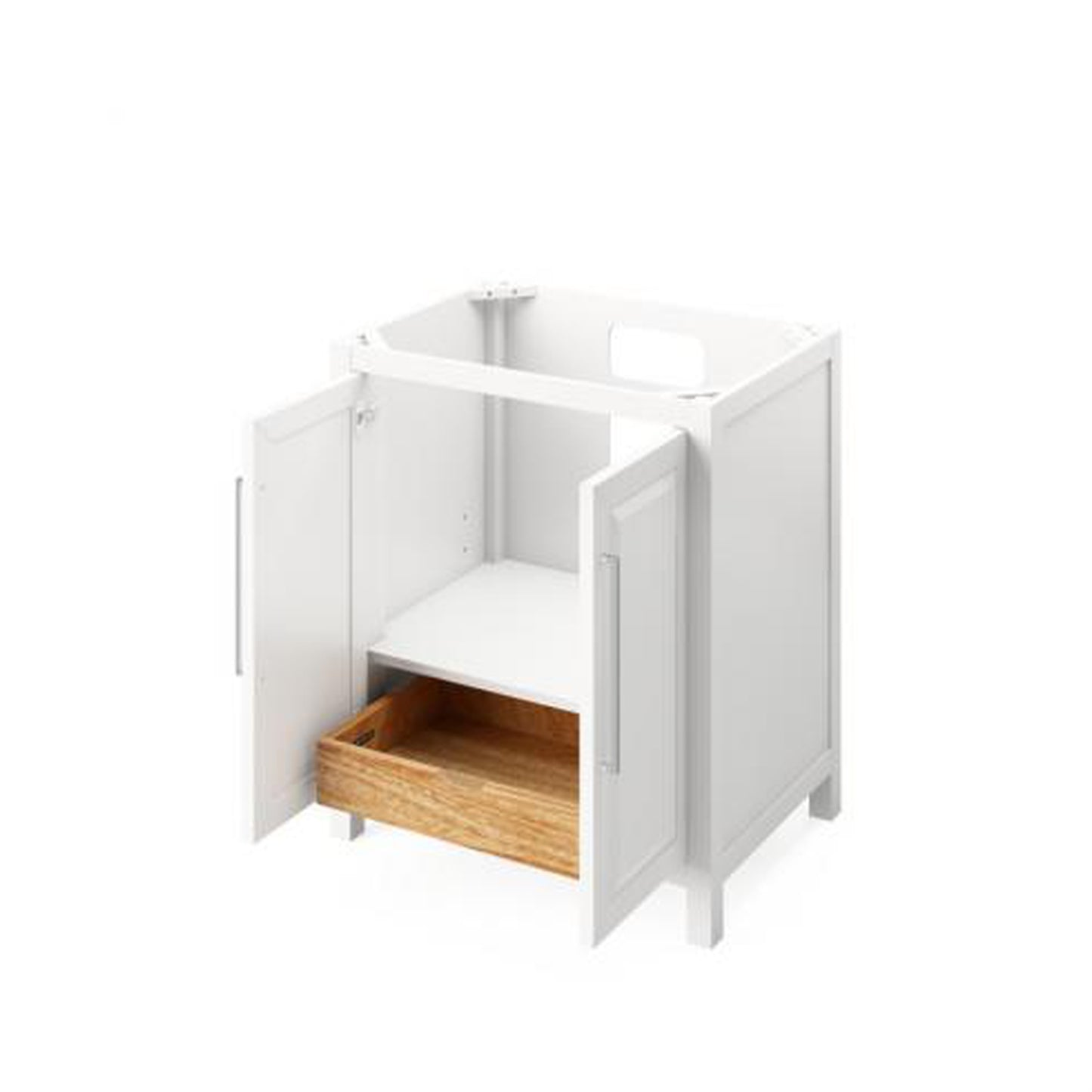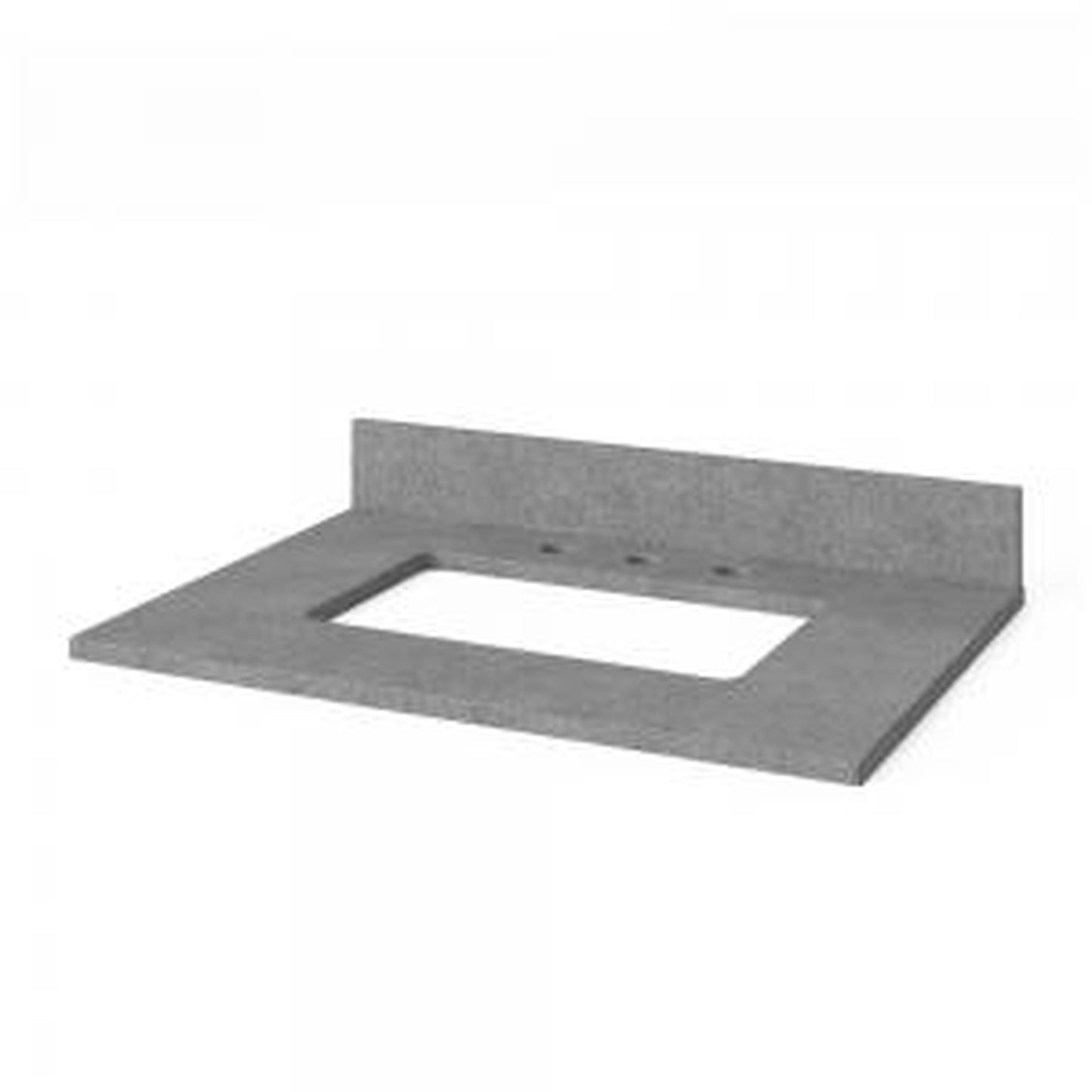 Sleek lines and raised panels come together to create a unique design for the sophisticated Cade vanity collection. Contemporary Stanton pulls adorn this White vanity in Polished Chrome, adding elegance and class. Cade's design styles merge to create a perfectly transitional vanity collection. A hardwood dovetail rollout drawer with full-extension soft-close undermount slides is situated underneath the adjustable shelf in the cabinet. Vanity measurements: 30" W x 21-1/2" D x 35" H. This 31" Steel Gray Cultured Marble vanity top is designed to fit 30" center bowl vanities. Small bits of white and Gray merge into a neutral salt-and-pepper finish. This neutral Gray is spread evenly throughout, creating an ideal surface. The center rectangle cutout is sized to fit our undermount rectangle vanity bowl. Three holes are cut for an 8" widespread faucet, and a 4" tall backsplash is included. This vanity top is designed to overhang ½" on each side and in front of the vanity. Top measurements: 31" W x 22" D x 25 mm H. Backsplash dimensions: 31" D x 25 mm W x 4" H. Some assembly required. Faucet not included.