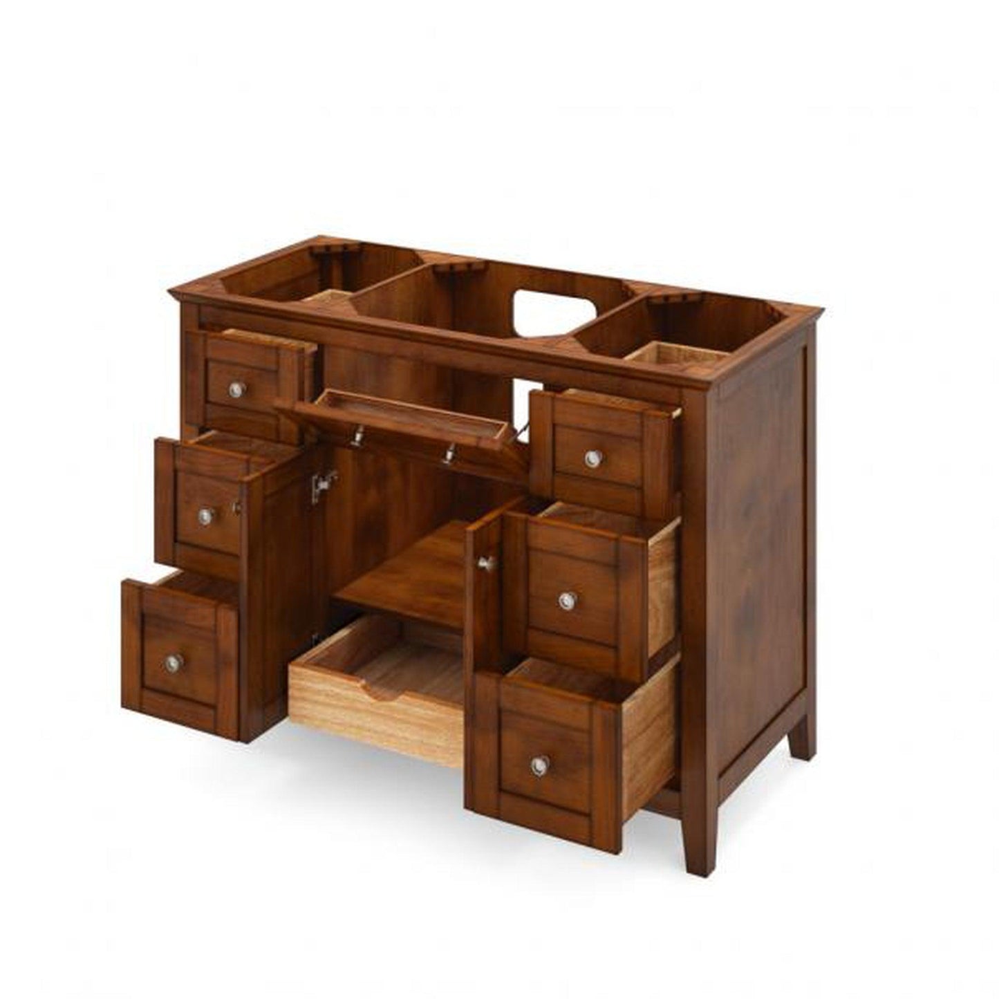 - Maximum storage with hardwood custom tipout tray, multiple dovetail drawers, and adjustable shelf