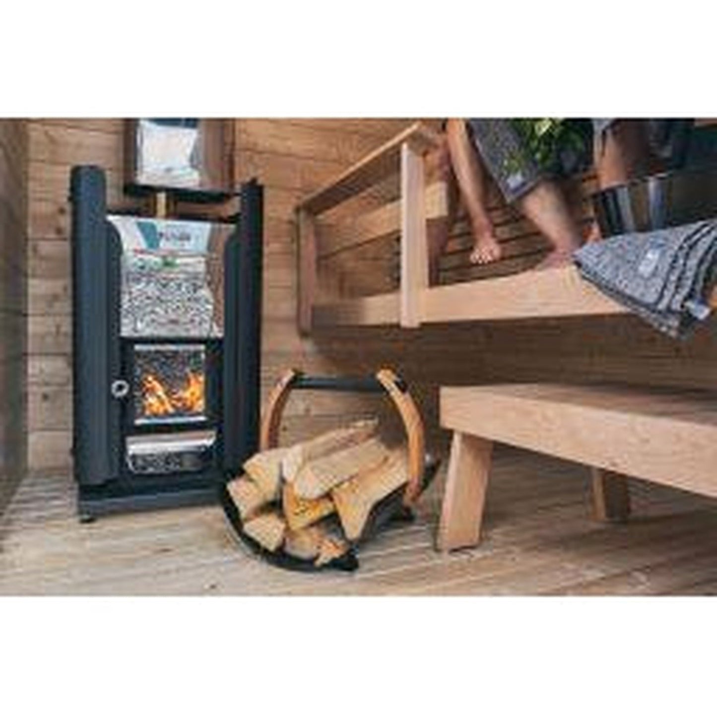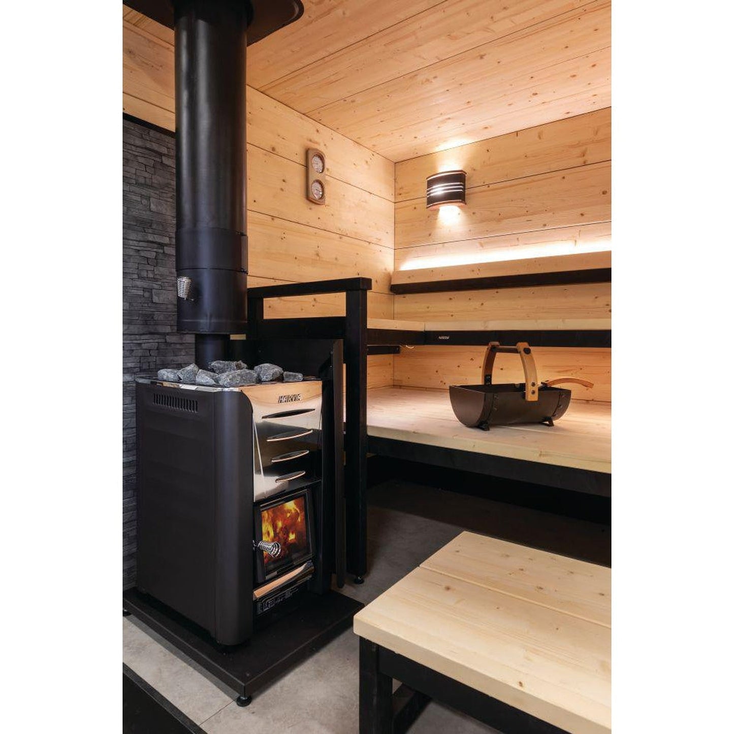 The Harvia Pro 20 wood-burning heater is designed for vigorous bathing in medium-sized saunas. The wood-burning heater has a large stone compartment and steel upper grating. The fire glowing behind the cast-iron-framed glass door adds to the ambiance of the sauna. The sturdy 10-millimeter-thick fire chamber cover ensures durability. The model also features adjustable feet to facilitate installation. They can be used, for example, to adjust the height of the smoke outlet.