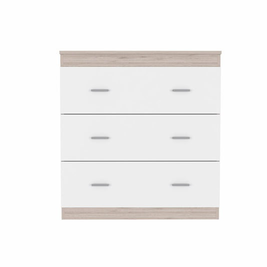 Add personality to your bedroom style and a feeling of coziness with this 33” Light Gray and White Dresser with Three Drawers, and make your room functional and visually relaxing with this masterpiece. The light gray and white color visually defines a balance and clean feel and produces consistency with other colors or designs in your house. This dresser drawer features three spacious drawers with full extension rails and durable silver finish and dual metal handles, making it perfect storage for all kinds of apparel. While the versatile top surface is spacious enough for any quick access essentials or a spot to showcase your style décor. This versatile dresser drawer can also serve as your nightstand in your bedroom and the top surface can be an alternative to hold your small flatscreen TV, any smart device, gaming console, or simply for serving coffee drinks in your bedroom or living room. This light gray and white dresser is crafted from durable particleboard which is perfectly designed to resist moisture and humidity, to provide a tough piece of furniture that will last. Make your bedroom more welcoming with this brand-new modern style and functional piece to keep your bedroom space highly organized with style. 33.50” X 31.50” X 16.40”