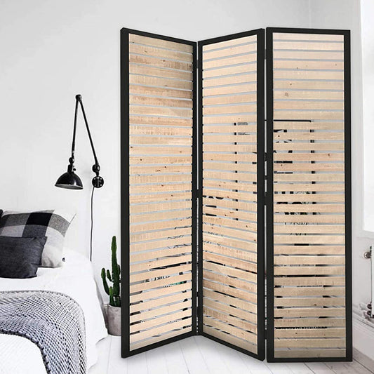 This natural brown wood screen will make an exceptional artistic display in any living space. it stands at an impressive 41 by 1.5 by 67 inches, with each panel seamlessly carved from strong natural wood. its intruiguing hybrid of contemporary vibes and transitional flair is just what you need to upgrade your home decor. an outstanding feature of this screen is its multi-dimensional nature which makes it suitable for use as a room divider or to create a private space. better still, it can be used as an attractive backdrop for any purpose. it features a solid metal panel which is smoothly polished in black semigloss and accented with uniform horizontal solid wood cream white insets.