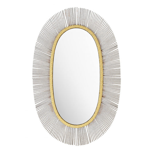 With this black and gold oval mirror you can add a touch of contemporary grace to your home. The mirror is made from stainless steel and features an oval mirror in the center of the frame. The stainless steel frame has black vertical lines all around that fan out and give the mirror a hefty yet elegant look. The oval mirror on the inside has a thick gold border that has a rustic finish to it. You can hang this in the hallway or in any room in your home to instantly add brightness and a larger sense of space. A hardware kit is included in the package to make it easy for you to hang this mirror up. Add a decorative touch to your home or gift it to your friends and family as a house-warming gift. Product 38.2" H x 24.5" W x 1.5" D. Mirror 27.75" H x 14" W