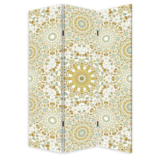 This quirky Contemporary Blue Boho Mandala Three Panel Room Divider Screen will give your space a much needed attention-grabbing aesthetic. With its intricate, mulit-colored bohemian inspired pattern and shapes, this screen is the perfect way to add interesting and vibrant visuals and colors to any room. The screen is reversible with different and coordinating images on each side. The high-grade wood canvas over wood used makes for a sturdy room divider that can withstand the test of time. The hinged design allows for this screen to fold up, providing an interchangable furniture piece that can be used to seperate a room or simply as a decorative item. 72" x 48" x 1"