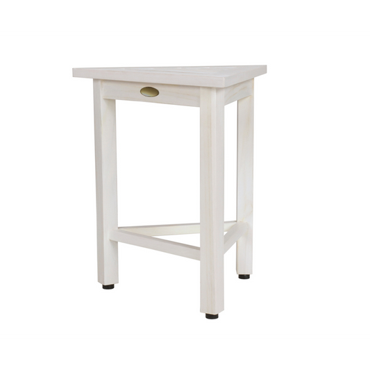 Accent your bathroom like those designer spas with this Hotel Whitewash Teak Triangle Corner Shower Bench or Shelf. Extremely versatile in design and use, this sustainably harvested solid teak wood bench is great for the shower, the bathroom, the family room, poolside or porch. Use as a seat, use as shelf, use a plant or accessory holder. Perfect for any corner or space you might need. Add a few together like puzzle pieces to increase and change the shape and size. Built to last, this hearty bench is made of real teak which is known for it's durability and resitance to water and mold. 18" x 17" x 15"