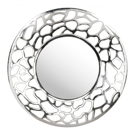 Bring the sea to your home with this silver coral pattern round mirror. The mirror is made from stainless steel and features a fun coral reef pattern that not only adds depth but also movement to the circular frame. The wave pattern is polished to a silver shine which brings in a elegant element to the mirror. There is a round mirror in the middle surrounded by a thick silver border. The light bounces off the mirror and the cool silver finish of the frame beautifully and makes your room appear brighter and more spacious. You can use it yourself or you can gift it to your friends and family. A hardware kit is included to help you hang the mirror up. 30.3" H x 30.3" W x 1.2" D