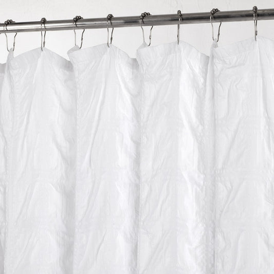 Nothing beats the soothing sensation of a refreshing shower after a long day, and with this White Modern Striped Crinkle Shower Curtain, you can turn that experience into a spa-like experience. The lovely white-colored base with horizontal striped silhouettes lends a touch of modern simplicity and freshness to any space for a calming vibe, making it an ideal accent for any bathroom arrangement. Made of polyester fibers in a crinkle fashion for added texture while being super durable to last long and easily washable by hand and machine. This curtain will not only add more privacy to your bathroom space and keep splashes off the floor but also be a decorative accent to your shower area. Meant to be a fashionable and functional piece of decor, this minimalistist shower curtain will evoke an airy ambiance with a sense of luxury in your modern bathroom space. 70” x 72”