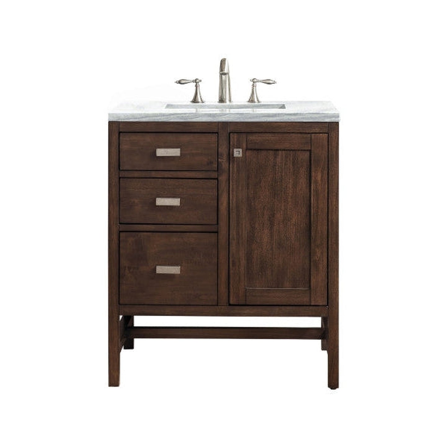 The Addison Collection 30-in. Free-standing Vanity by James Martin Vanities comes in a mid-century finish on parawood with a solid surface top giving you a fresh take on Shaker-inspired design with a look of luxury. Handcrafted and gender-neutral, it fits effortlessly into modern or transitional rooms. This versatile vanity shows off its elegant style with a rectangular basin of white ceramic.