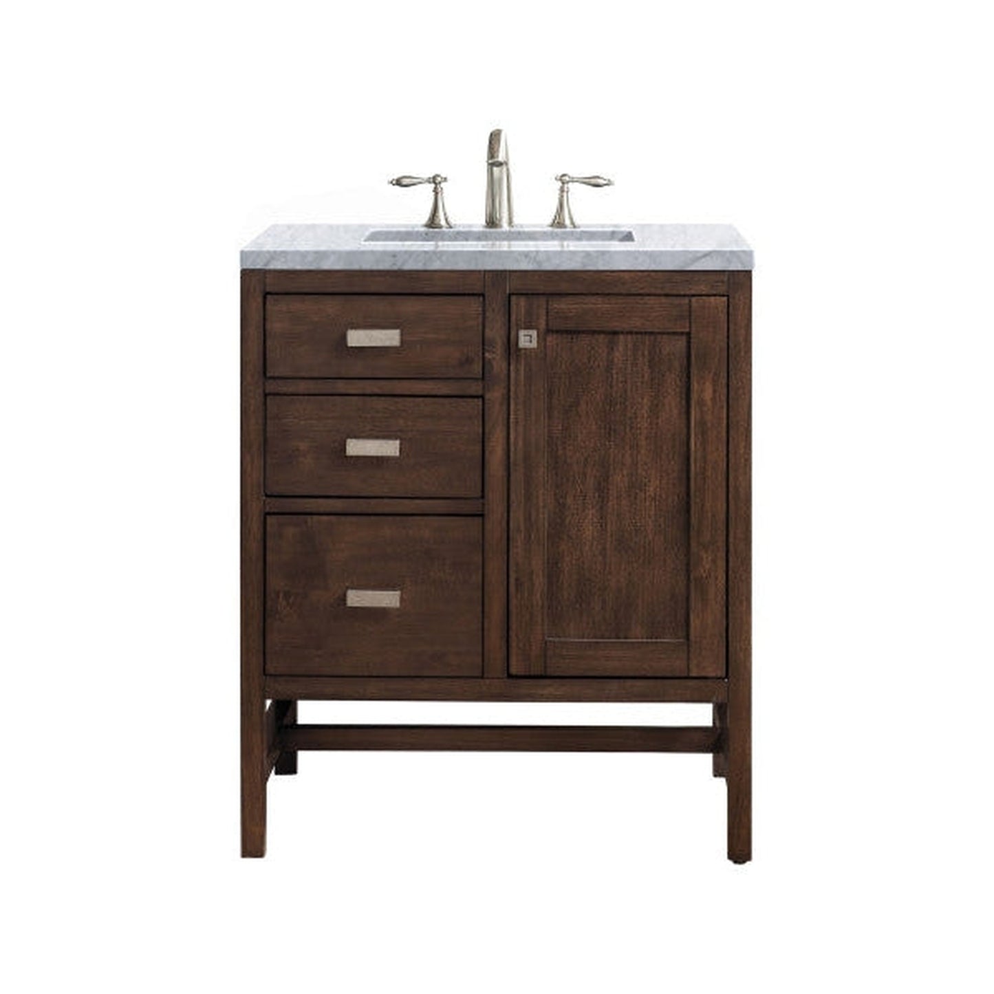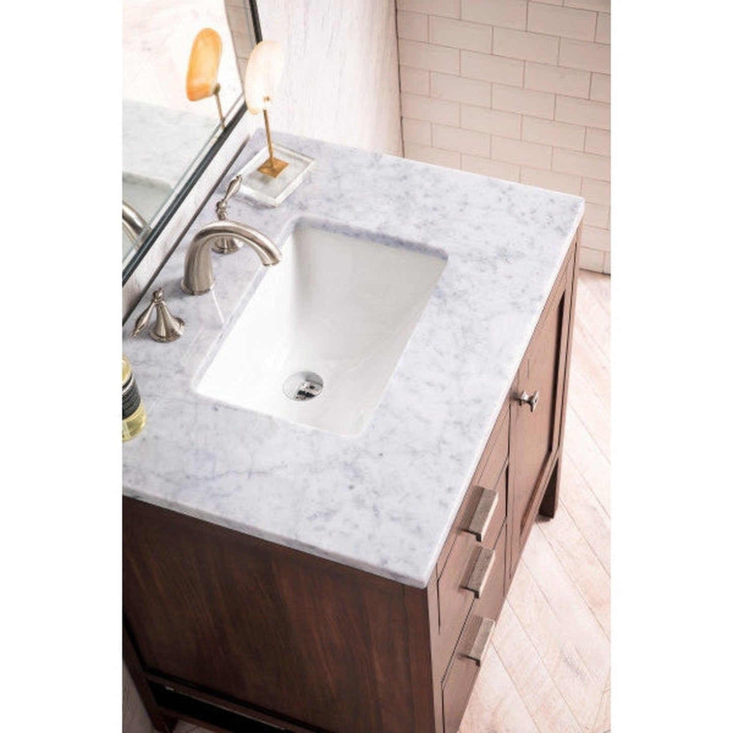 James Martin Addison 30" Single Mid Century Acacia Bathroom Vanity With 1" Carrara White Marble Top and Rectangular Ceramic Sink