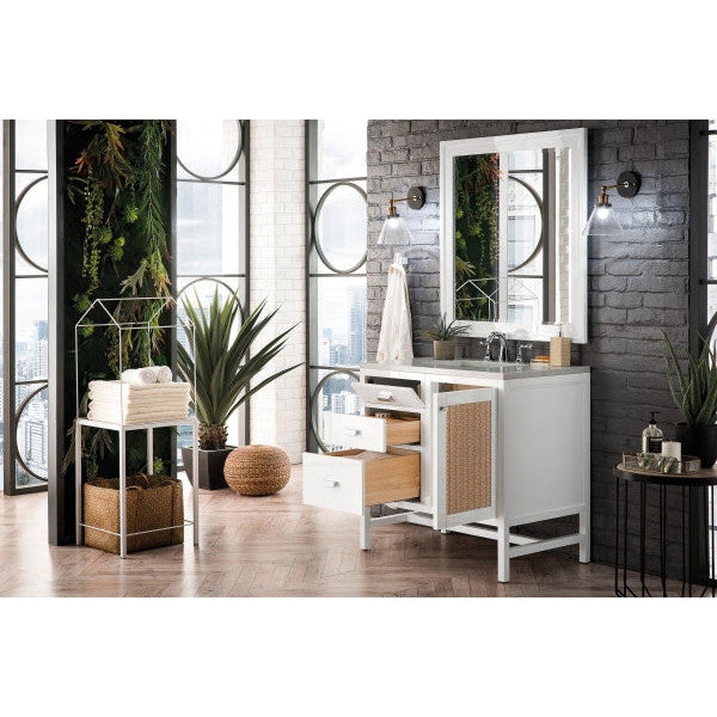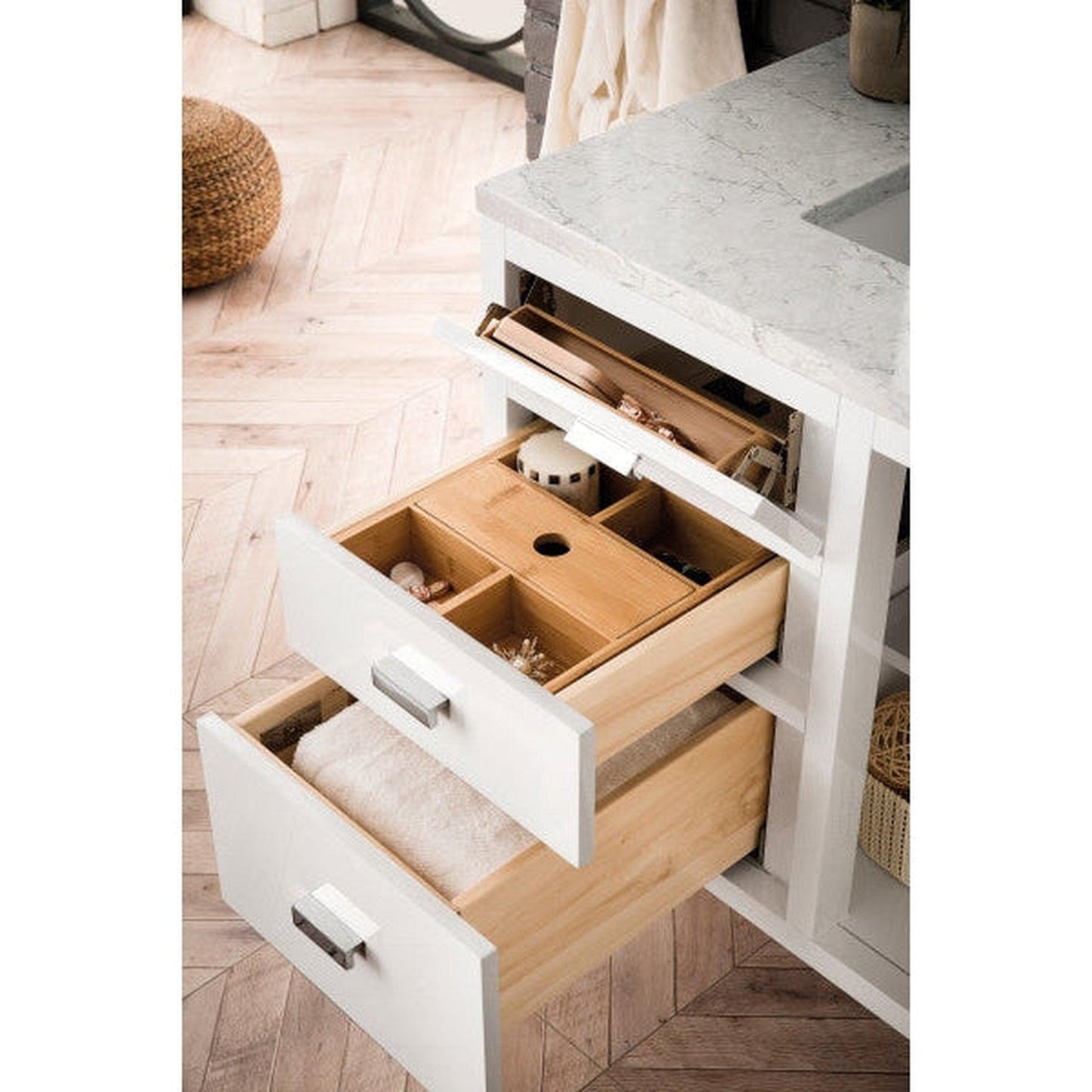 The Addison Collection 36-in. Free-standing Vanity by James Martin Vanities comes in a glossy white finish on parawood with a quartz top giving you a fresh take on Shaker-inspired design with a look of luxury. Handcrafted and gender-neutral, it fits effortlessly into modern or transitional rooms. This versatile vanity shows off its elegant style with a rectangular basin of white ceramic.