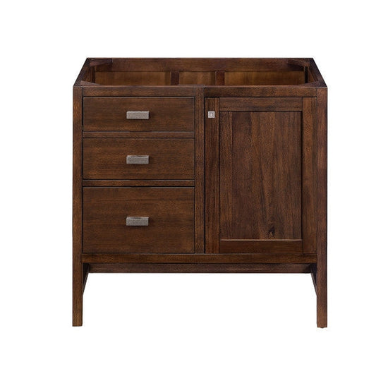 The Addison Collection 36-in. Free-standing Vanity by James Martin Vanities comes in a mid-century finish on parawood with a quartz top giving you a fresh take on Shaker-inspired design with a look of luxury. Handcrafted and gender-neutral, it fits effortlessly into modern or transitional rooms. This versatile vanity shows off its elegant style with a rectangular basin of white ceramic.