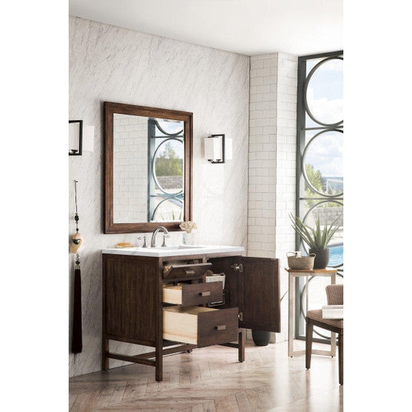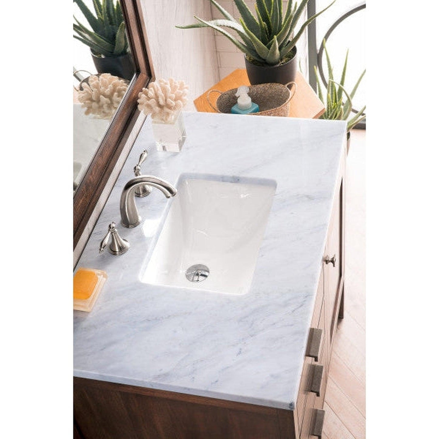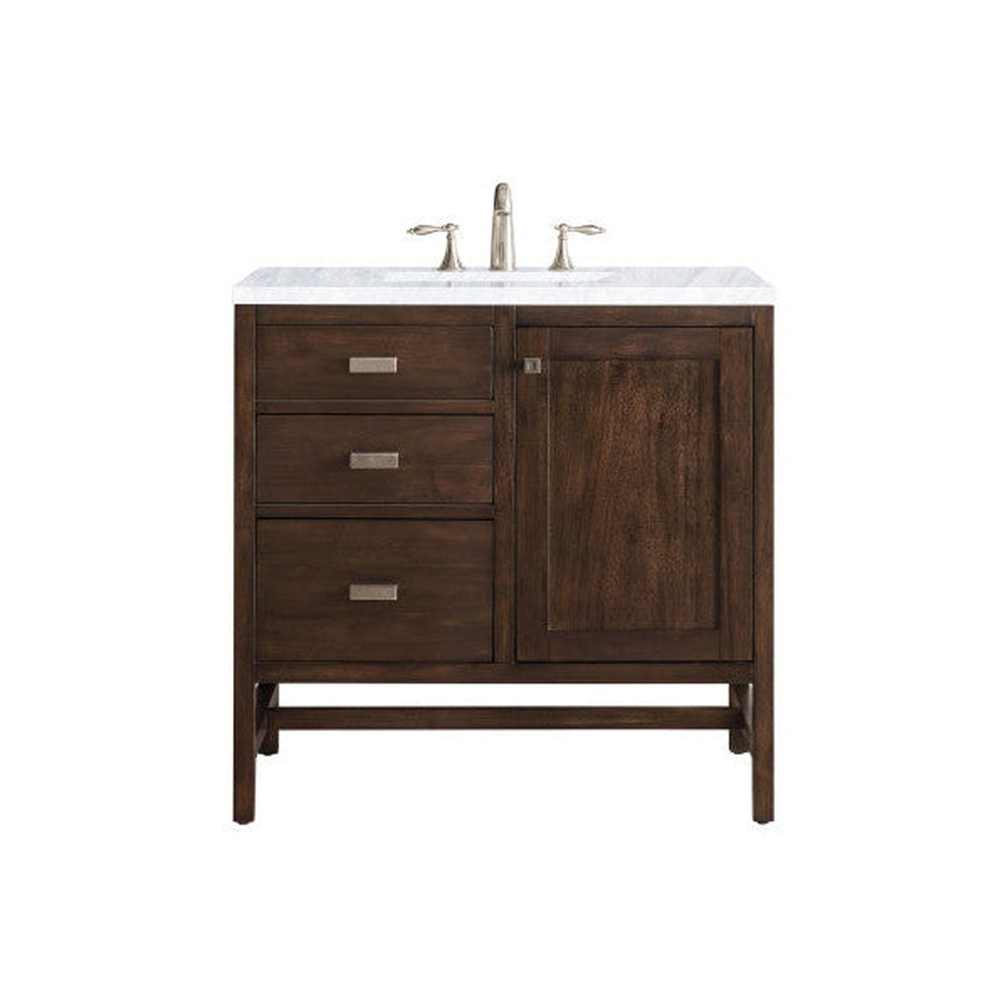 James Martin Addison 36" Single Mid Century Acacia Bathroom Vanity With 1" Carrara White Marble Top and Rectangular Ceramic Sink