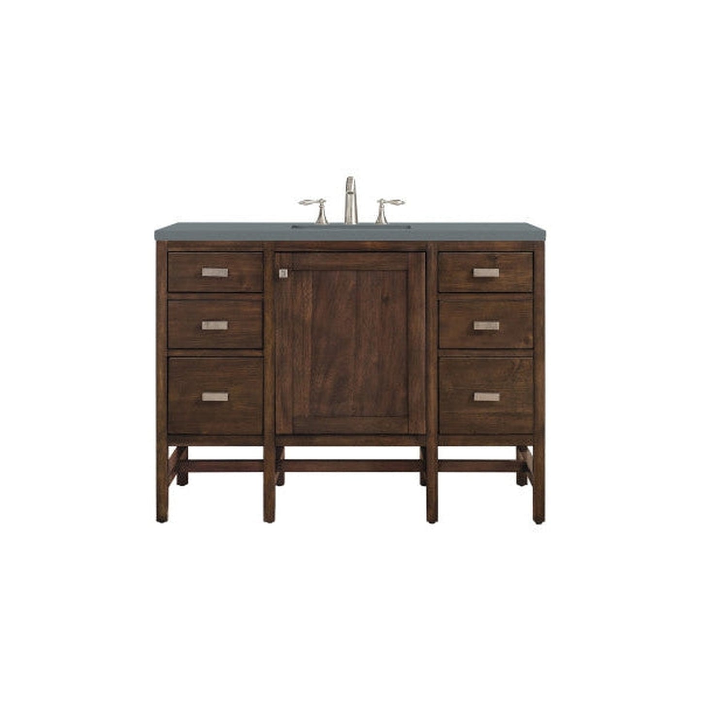 The Addison Collection 48-in. Free-standing Vanity by James Martin Vanities comes in a mid-century finish on parawood with a solid surface top giving you a fresh take on Shaker-inspired design with a look of luxury. Handcrafted and gender-neutral, it fits effortlessly into modern or transitional rooms. This versatile vanity shows off its elegant style with a rectangular basin of white ceramic.