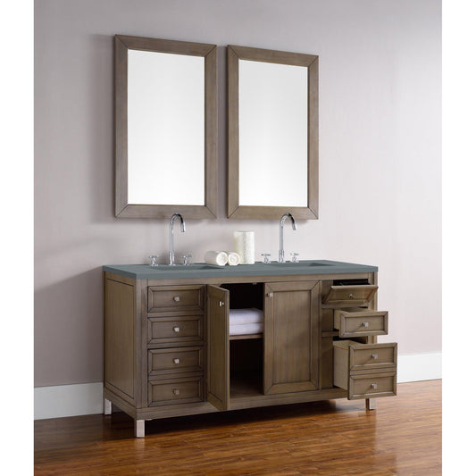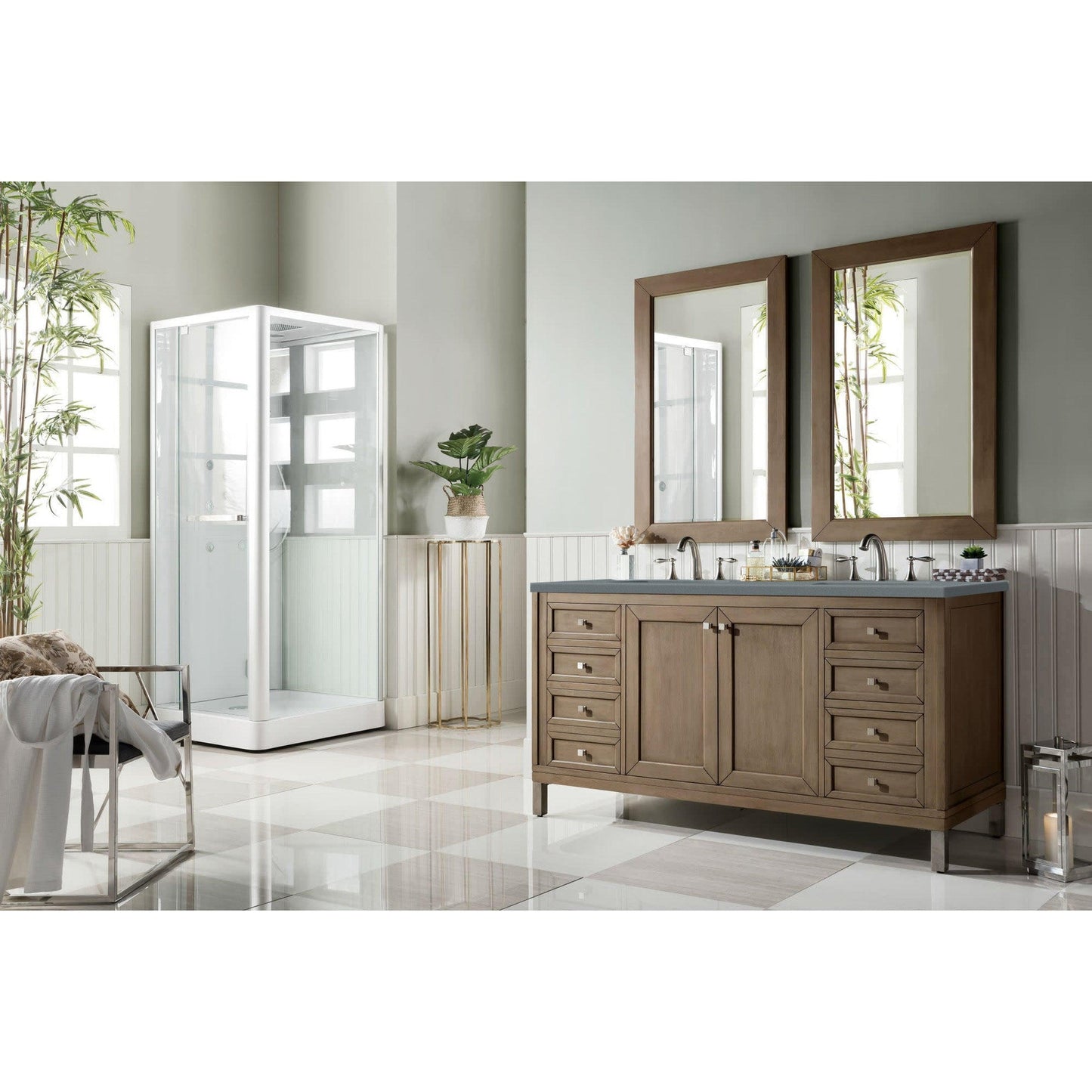 James Martin Chicago 60" Double Whitewashed Walnut Bathroom Vanity With 1" Cala Blue Quartz Top and Rectangular Ceramic Sink