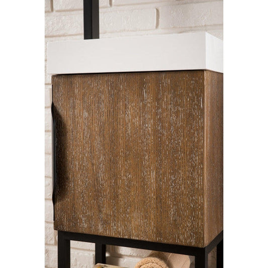 James Martin Columbia 16" Single Latte Oak Bathroom Vanity With Matte Black Hardware and 3" Glossy White Composite Countertop