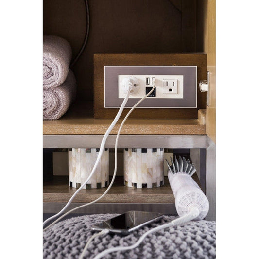 The Columbia 59" Latte Oak vanity offers maximum storage with two soft-closing doors, three soft-closing drawers, and lower shelf space. This cabinet Includes premium features such as one solid bamboo in-drawer organizer and one 120 volt UL Rated electrical component with two electrical and two USB (2.0) outlets.