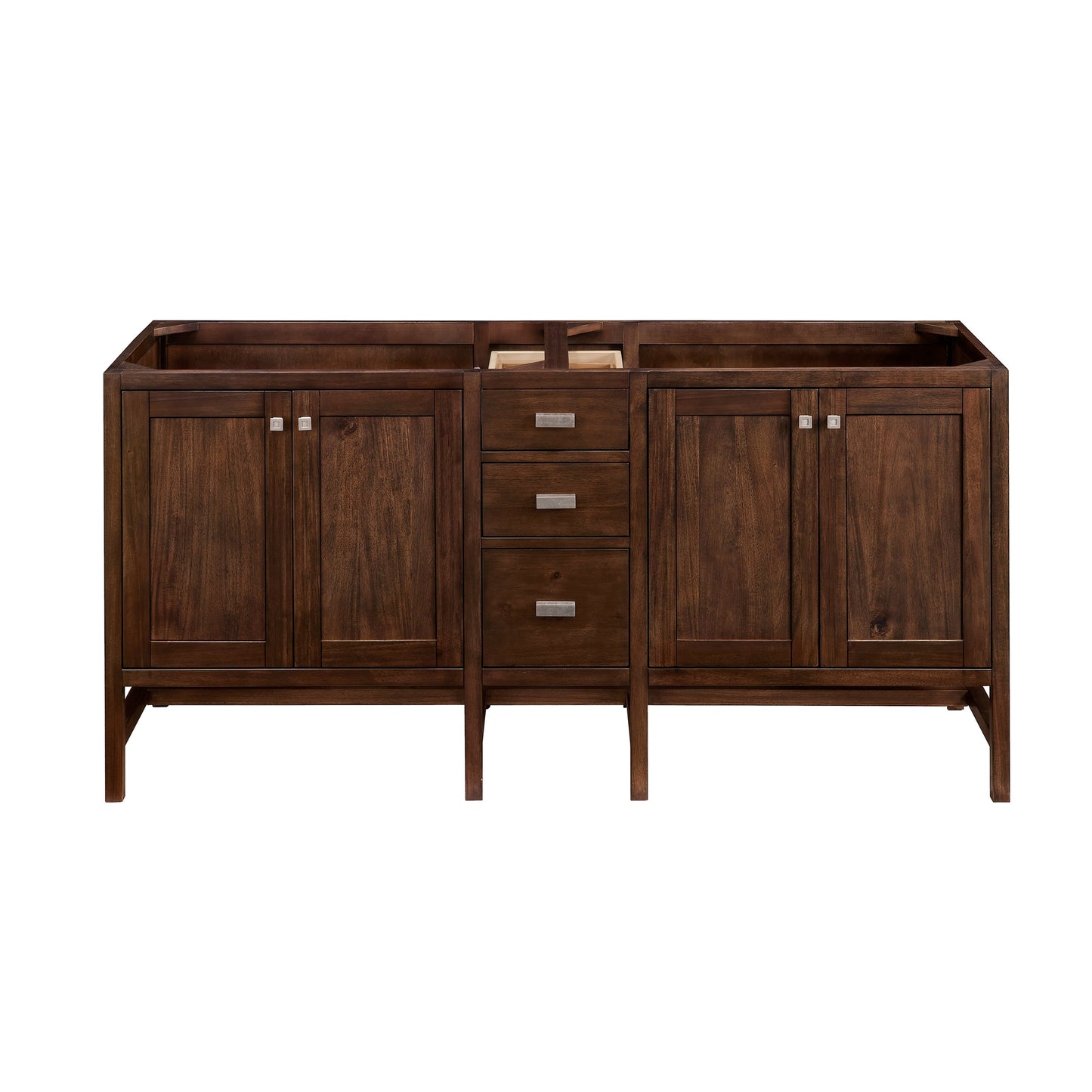 The Addison Collection 72-in. Free-standing Double Vanity by James Martin Vanities comes in a mid-century finish on parawood giving you a fresh take on Shaker-inspired design with a look of luxury. Handcrafted and gender-neutral, it fits effortlessly into modern or transitional rooms. The Shaker touch comes from the sides, drawers, and doors. Each of the drawers feature full extensions with a undermounted slides as well as a brushed aluminum finished laminate that goes on the bottom of the drawer for easy clean up and like the door has a soft-close. The body of the cabinet is made of solid hardwood and sturdy panels of MDF.