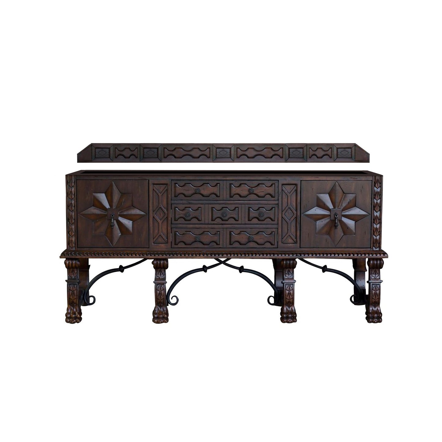 - Hand-carved details on cabinet and legs, with decorative iron scrollwork base