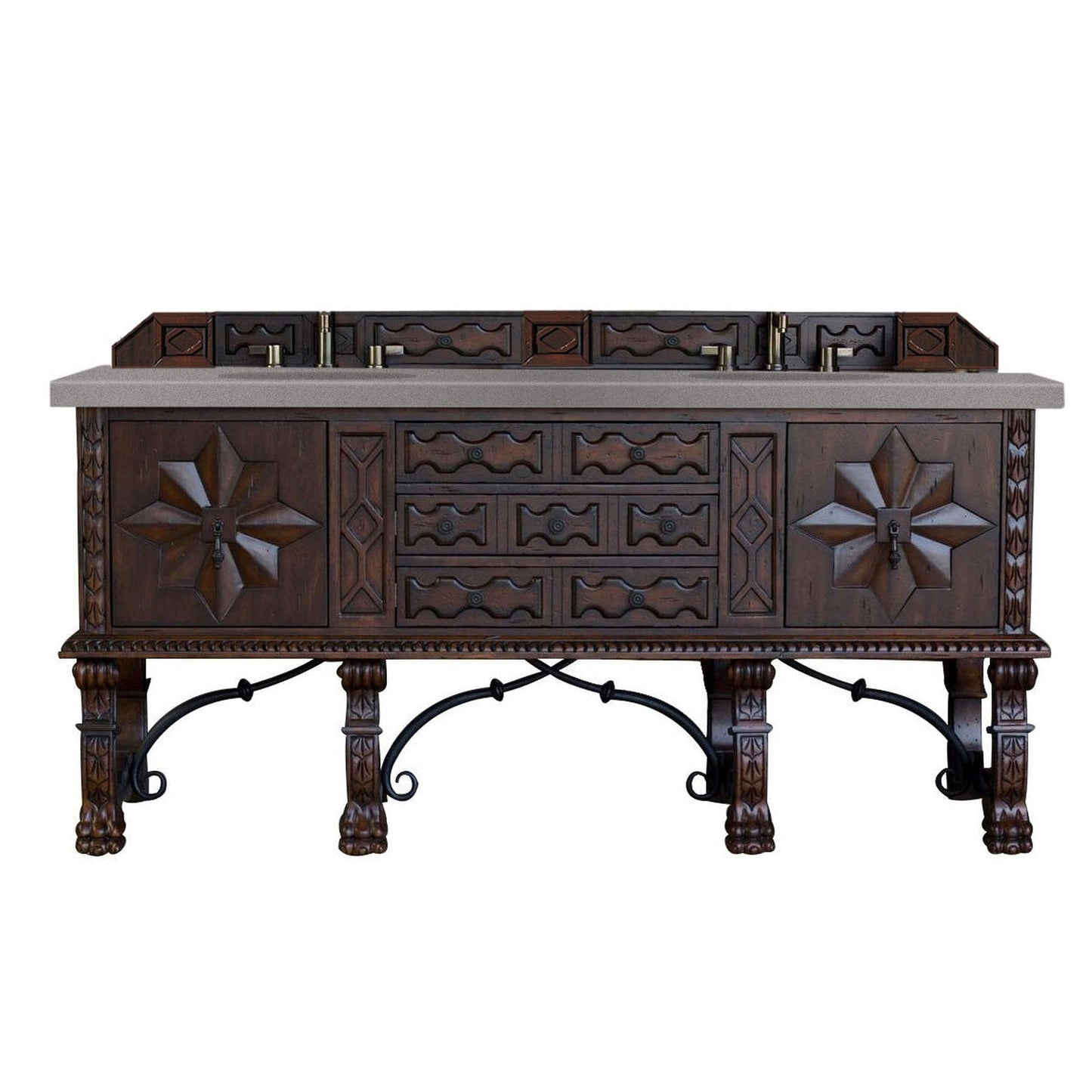 The Balmoral 72", double sink, Antique Walnut vanity by James Martin Vanities features hand-carved details, from the cabinet feet all the way through the doors. The beautiful decorative Iron scrollwork accents this piece which includes three full-size drawers and two doors which open to additional storage. Antique pewter finished door pulls complete the look. The look is completed with a volcano textured Grey Expo top by Silestone and premium solid surface sink(s).