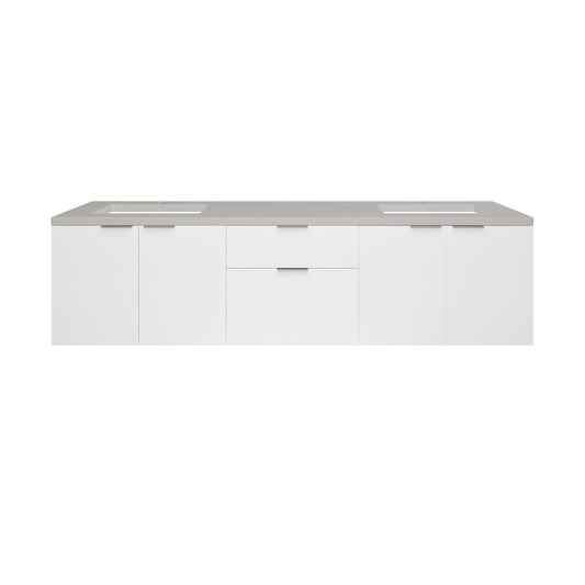 The 72 in. Brenlyn double vanity has a crisp modern look in glossy white with a brushed nickel base complimented by sophisticated tab pulls. The subtle contrast of the Pietra Gray Quartz top with ceramic undermount sinks adds rich detail. The versatile design allows for your choice of hanging the vanity on the wall for a trendy minimalist look or to use the shelf and base, included for a more traditional floor mount that also serves as extra storage. The vanity features 4 soft close doors, 2 drawers with full extension, undermount soft close glides, in addition to an integrated dual electric and USB outlet and a removable bamboo storage tray.