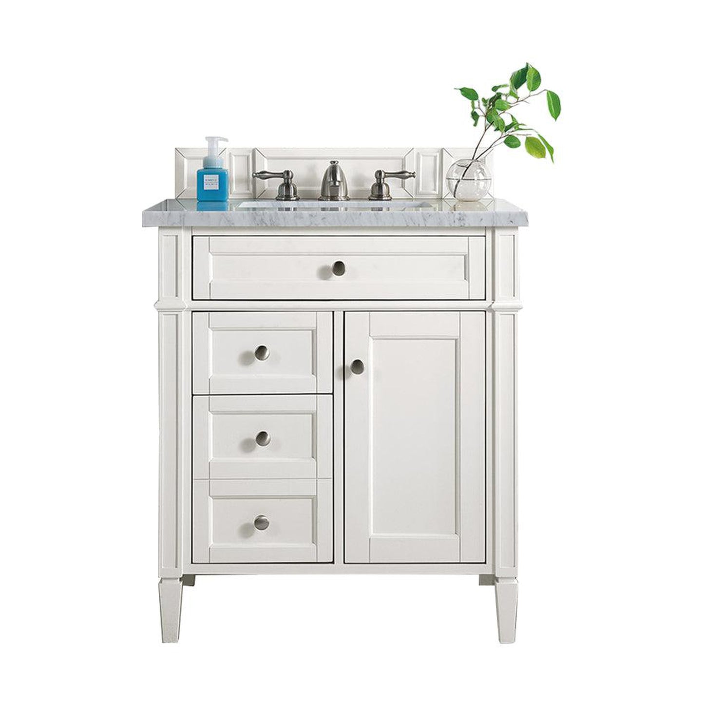The Brittany 30" Bright White vanity by James Martin Vanities features classic details that bridge both Traditional and Transitional styles. This beautiful piece of furniture includes one hide-away tip out, top row drawer plus two full-depth side drawers, one of which is double-height for storage of taller items. This cabinet also has one door, which conceals an interior shelf for ample storage, and a bamboo drawer organizer. Hand crafted in birch solids and birch veneers with satin nickel hardware. Matching wood backsplash is included. The look is completed with a 3cm eased edge Arctic Fall Solid Surface top with white porcelain rectangular sink.