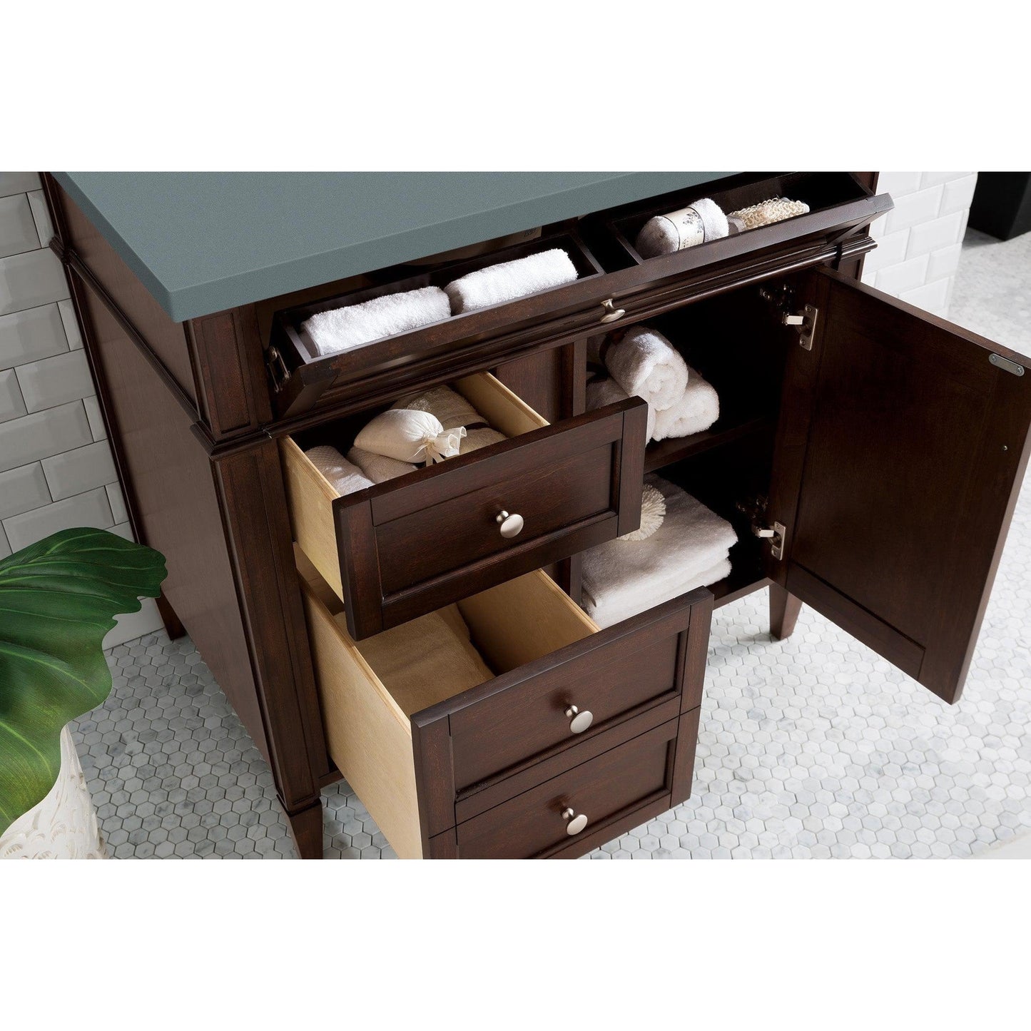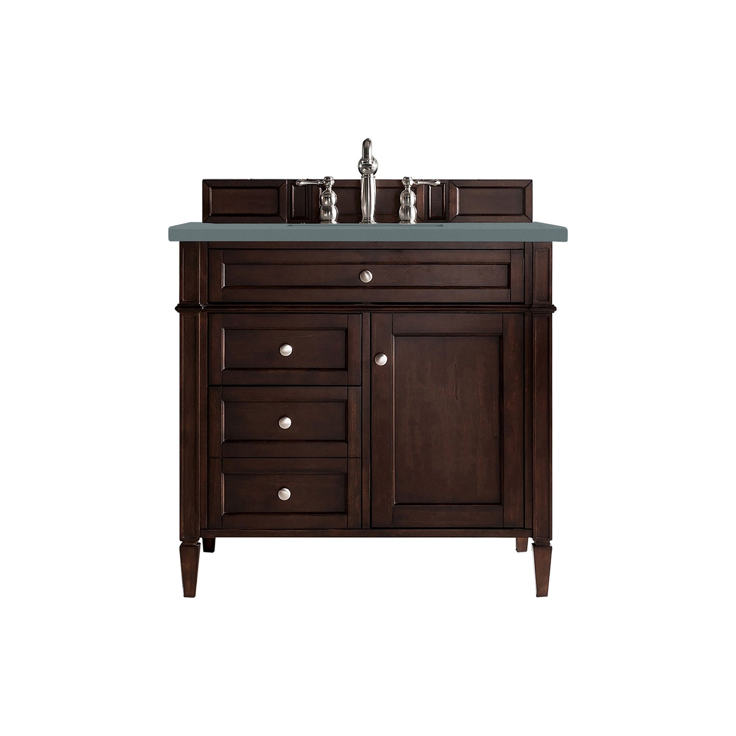 The Brittany 36" Burnished Mahogany vanity by James Martin Vanities features classic details that bridge both Traditional and Transitional styles. This beautiful piece of furniture includes one hide-away tip out, top row drawer plus two full-depth side drawers, one of which is double-height for storage of taller items. This cabinet also has one door, which conceals an interior shelf for ample storage. Hand crafted in birch solids and birch veneers with satin nickel hardware. Matching wood backsplash is included. The look is completed with a 3cm eased edge Cala Blue top by Silestone and a premium solid surface sink.
