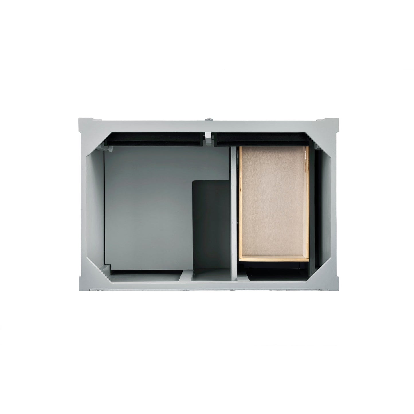The Brittany 36" Urban Gray vanity by James Martin Vanities features classic details with bridge both Traditional and Transitional styles. This beautiful piece of furniture includes one hide-away tip out, top row drawer plus two full-depth side drawers, one of which is double-height for storage of taller items. This cabinet also has one door, which conceals an interior shelf, for ample storage. Hand crafted in Birch solids and Birch veneers with Satin Nickel hardware. Matching wood backsplash is included.