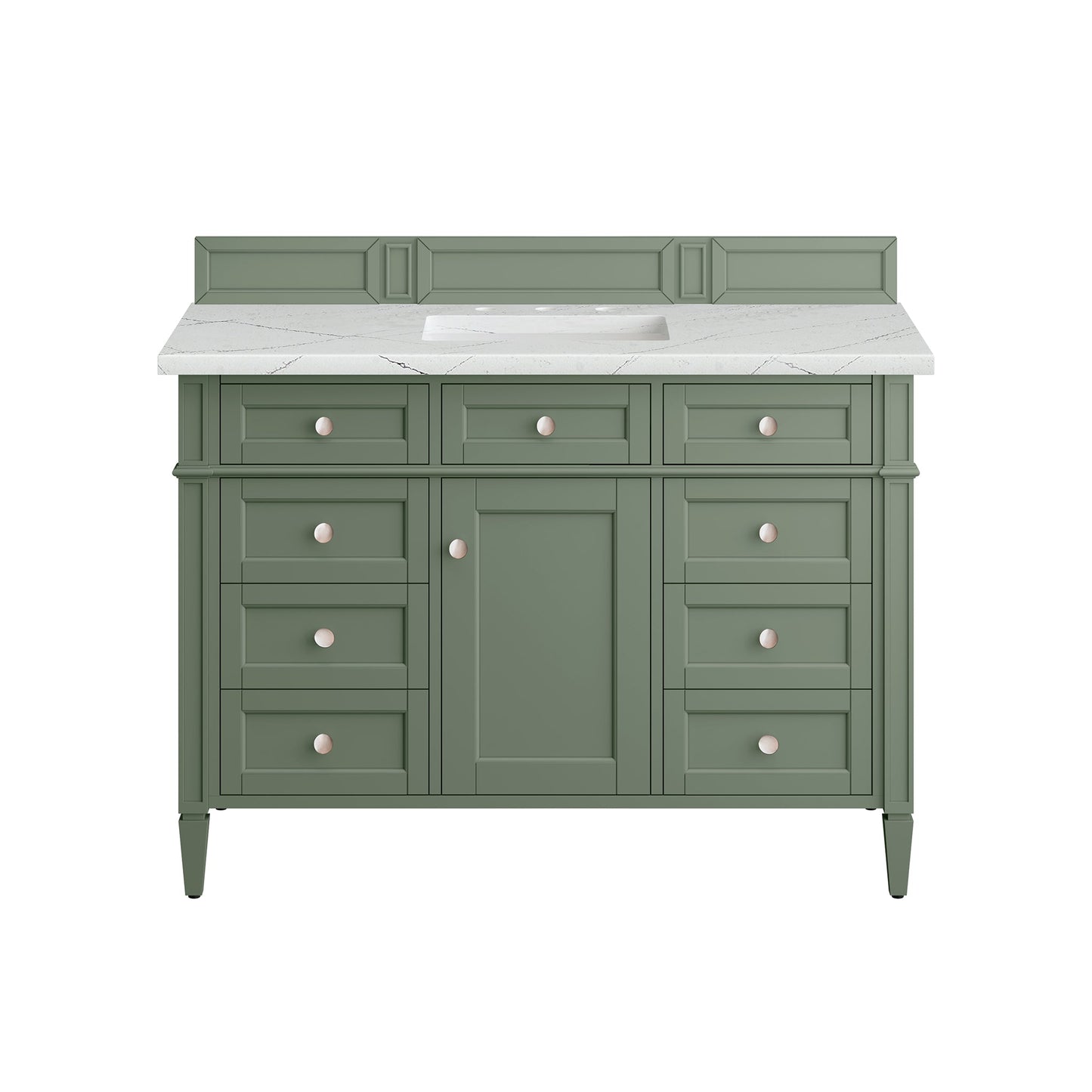 The Smokey Celadon finish on the 48" Brittany Vanity adds a refreshing, natural element to any bathroom space. This moody, yet muted green, with subtle blue and grey undertones, brings the rich, timeless details of the Brittany collection to life. The 48" cabinet, with decorative wood backsplash, features optimal organization with one hide-away tip-out drawer plus six side drawers, two of which are double height for storing taller items. This cabinet also has one door, which conceals an interior shelf. All drawers are lined with an aluminum laminate surface for easy cleaning and are equipped with undermount soft-close slides. The feathery, grey, and black veining on the cool white tones of the Ethereal Noctis quarts top create a modern classic look. All of our 3cm tops include a porcelain undermount sink.