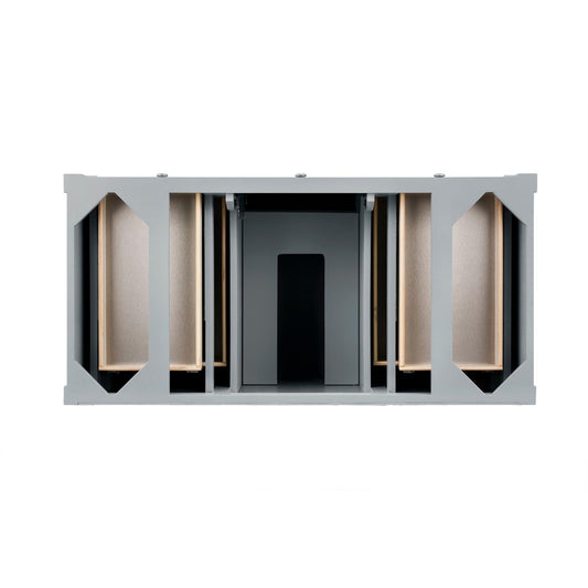 The Brittany 48" Urban Gray vanity by James Martin Vanities features classic details with bridge both Traditional and Transitional styles. This beautiful piece of furniture includes one hide-away top row tip out drawer, plus six full-depth drawers, two of which are double-height for storage of taller items. This cabinet also has one door, which conceals an interior shelf, for ample storage. Hand crafted in Birch solids and Birch veneers with Satin Nickel hardware. Matching wood backsplash is included.