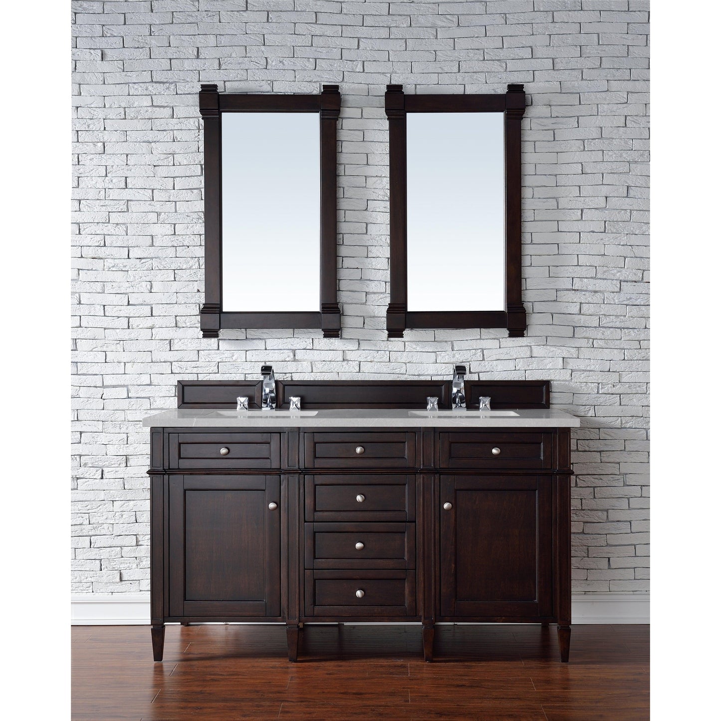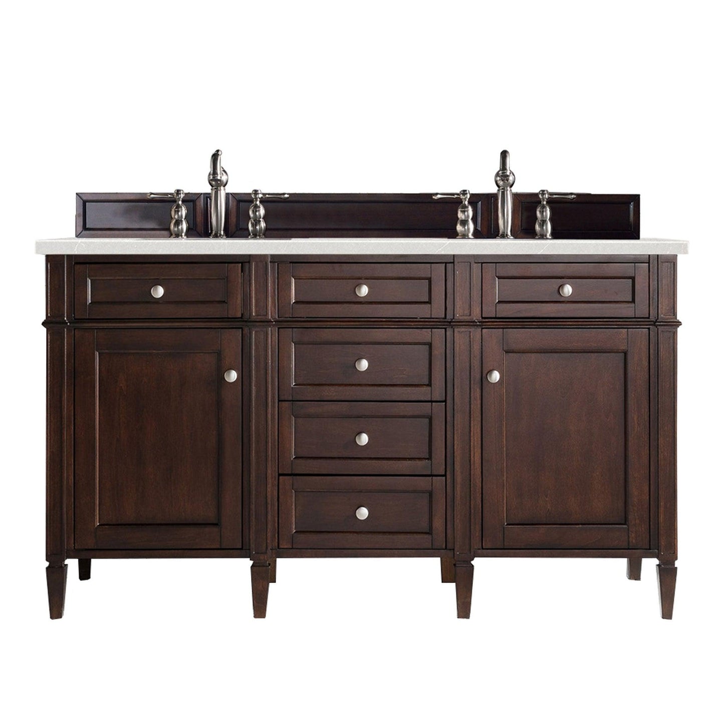 The Brittany 60" Burnished Mahogany double vanity by James Martin Vanities features classic details with bridge both Traditional and Transitional styles. This beautiful piece of furniture includes two hide-away tip out, top row drawers and four full-depth drawers. This cabinet also has two doors, which conceal an interior shelf for ample storage. Hand crafted in birch solids and birch veneers with satin nickel hardware. Matching wood backsplash is included. The look is completed with a 3cm eased edge 3cm eased edge Eternal Serena Quartz top with two white solid surface rectangular sinks.